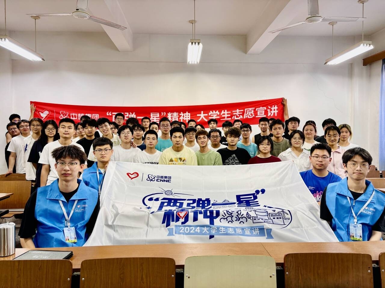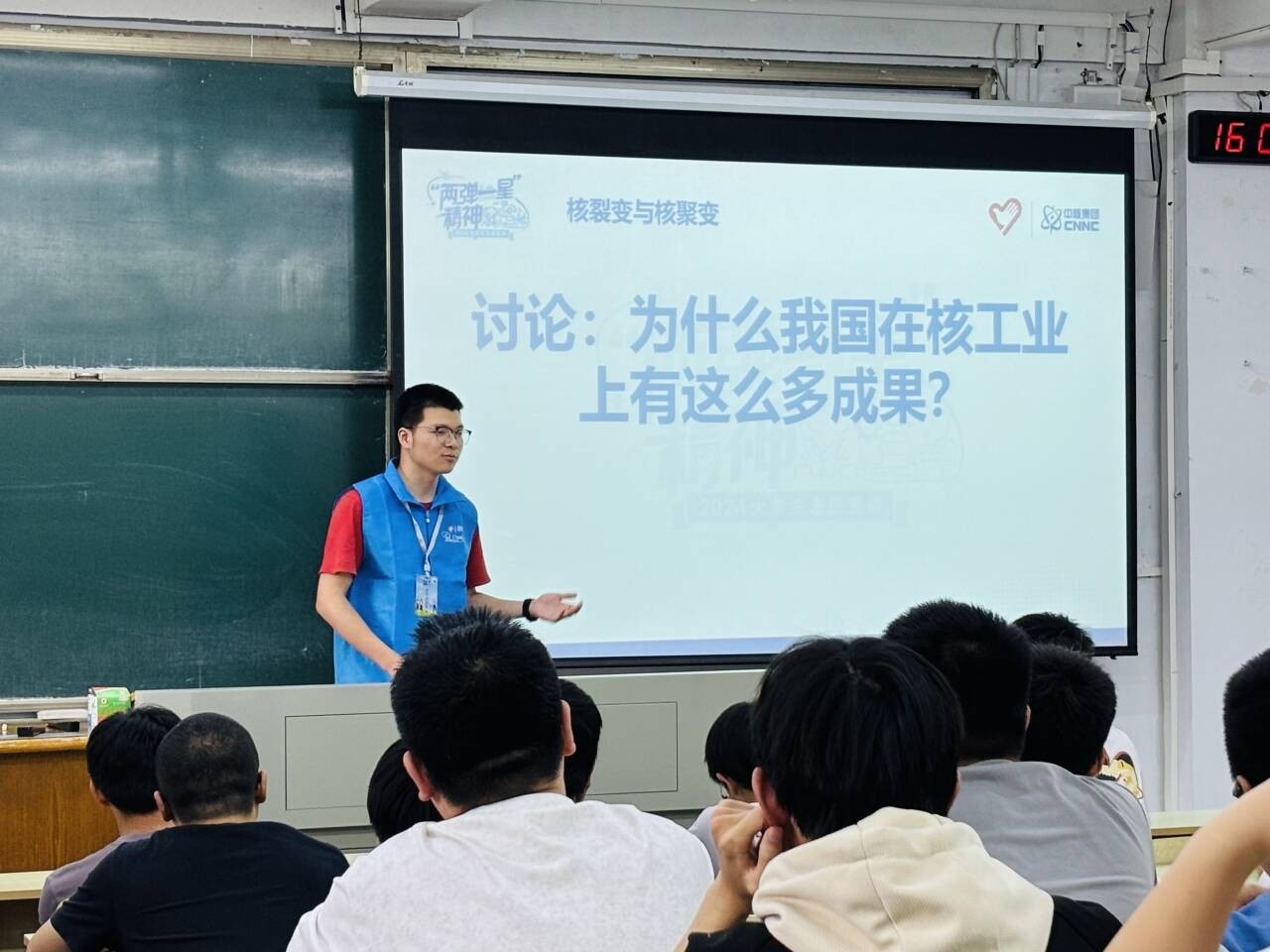 传承两弹一星精神,共筑中华民族伟大复兴梦。由团中央青年志愿者行动指导中心和中国核工业集团有限公司主办的两弹一星精神志愿宣讲活动在我校展开。江苏科技大学机械工程学院“两弹一星”宣讲团于6月15日在学校综合楼3-109内为大学一年级的同学们开展了有关“两弹一星”精神的宣讲活动。本次活动旨在通过讲述“两弹一星”背后的感人故事和辉煌成就,弘扬自力更生、艰苦奋斗、勇于探索、无私奉献的“两弹一星”精神和在现在中国核工业的发展。此次宣讲活动由六位同学(王其杰,吴浩然,王乃欣,陈杨,皇甫育名,钱彬凡)分别从神奇的核科技,神圣的核事业和神秘的核事业三个大部分来为我们的同学宣讲我们的两弹一星精神。