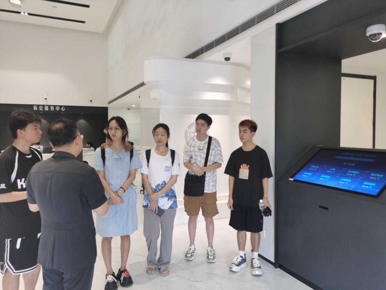 上海市第二中级人民法院的余宇老师带领实践队参观了诉讼服务中心。从安检到立案,余宇老师向我们介绍了上海二中院的先进经验和做法。从对当事人递交到法院的第一份材料进行扫描开始,到最终形成判决文书,上海二中院的所有办案过程都将形成电子化数据。此外,上海二中院运用生成式人工智能技术,正在打造“小至数字助手”,为当事人针对所遇到的问题获取个性化服务提供便利。上海二中院通过这些措施大幅减少当事人的诉讼成本,缩短立案等待时间,切实展现了其细化落实护民举措的显著成效。