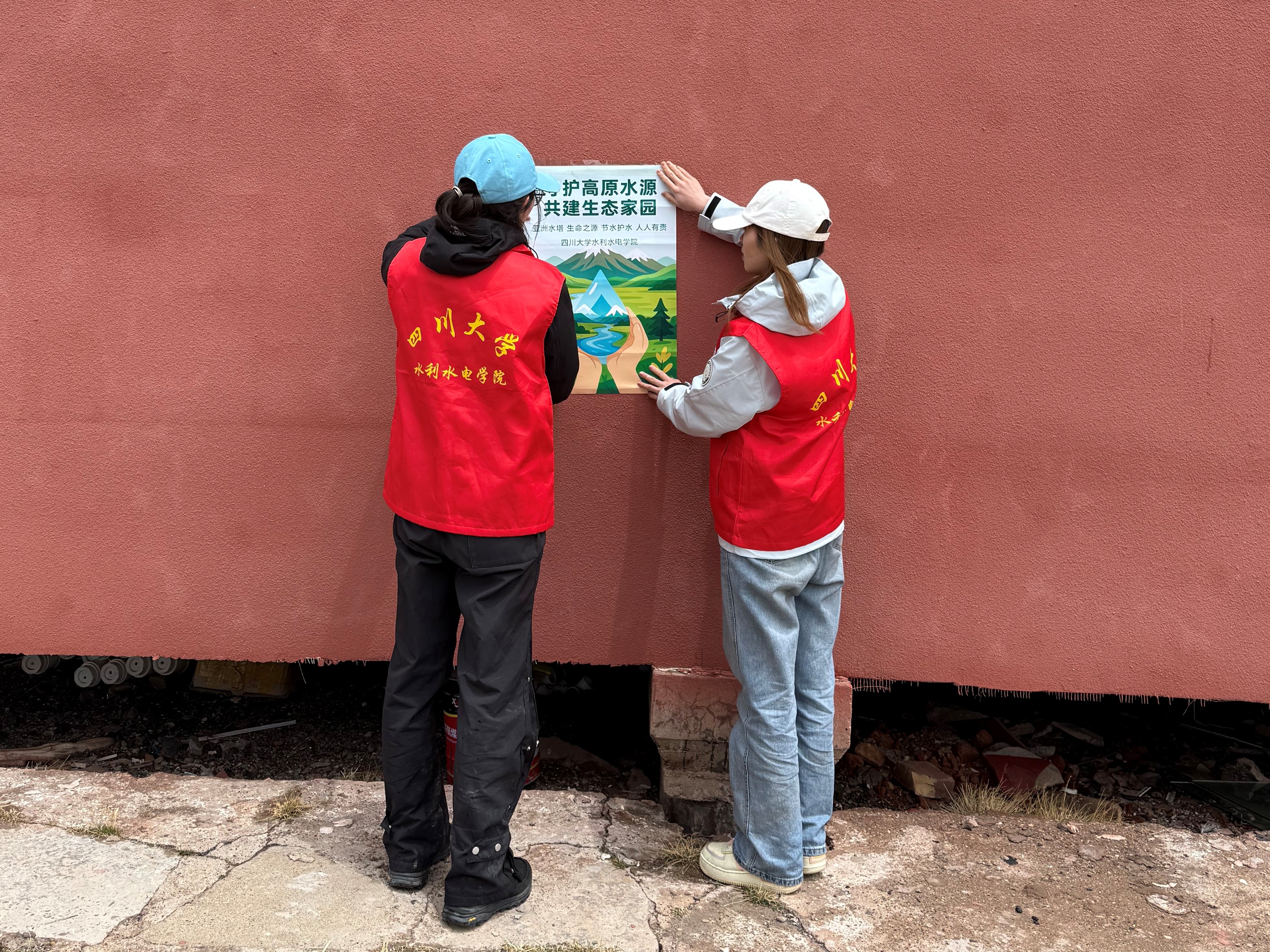 图为实践团成员张贴高原水资源保护宣传海报