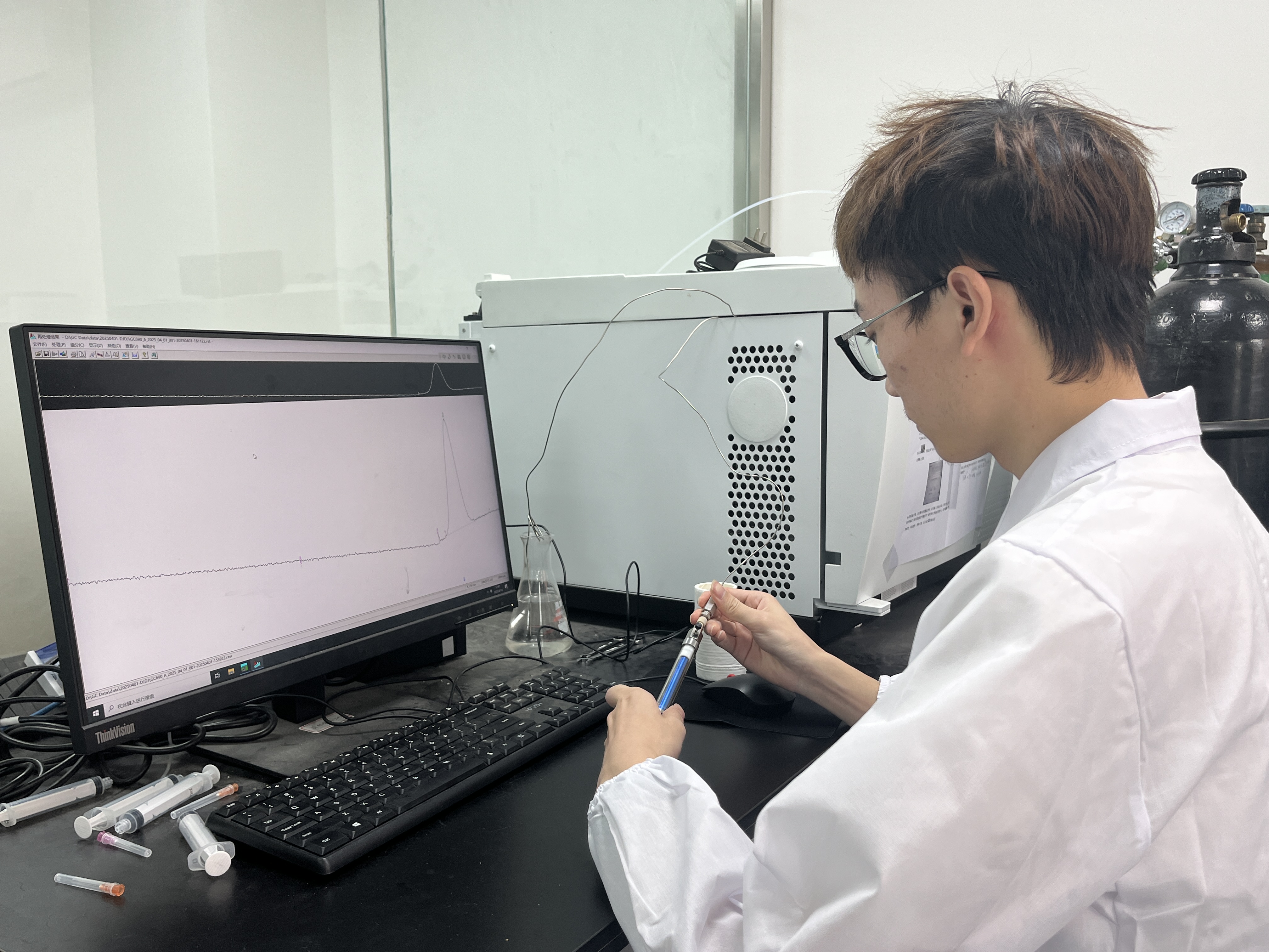 图为实践团成员使用气相色谱仪测量温室气体