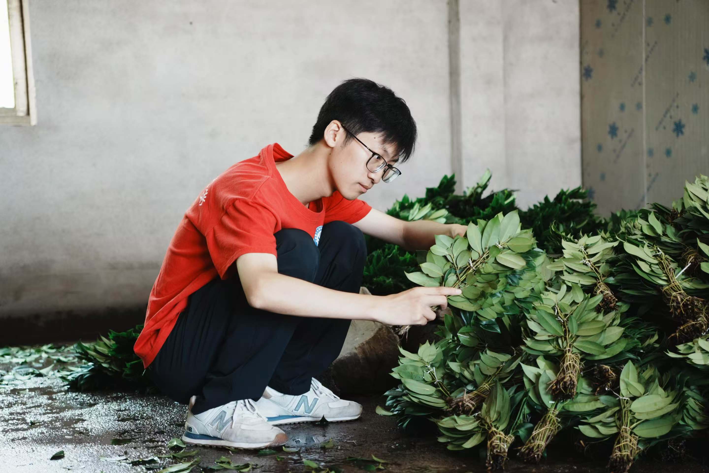 “杨桐枝条修剪后要自然晾晒,不能用烘干设备,这样才能保持叶片的天然色泽。”在贺堂村杨桐加工厂,村干部曾铜兴的介绍让队员们停下了手中的记录。实践队通过调研发现,当地杨桐、竹制品加工均采用“原料本地化、工艺低碳化”模式,废料经处理后还田成为有机肥,形成闭环生态链。既保护了当地环境,也让村民的人均收入显著增加。