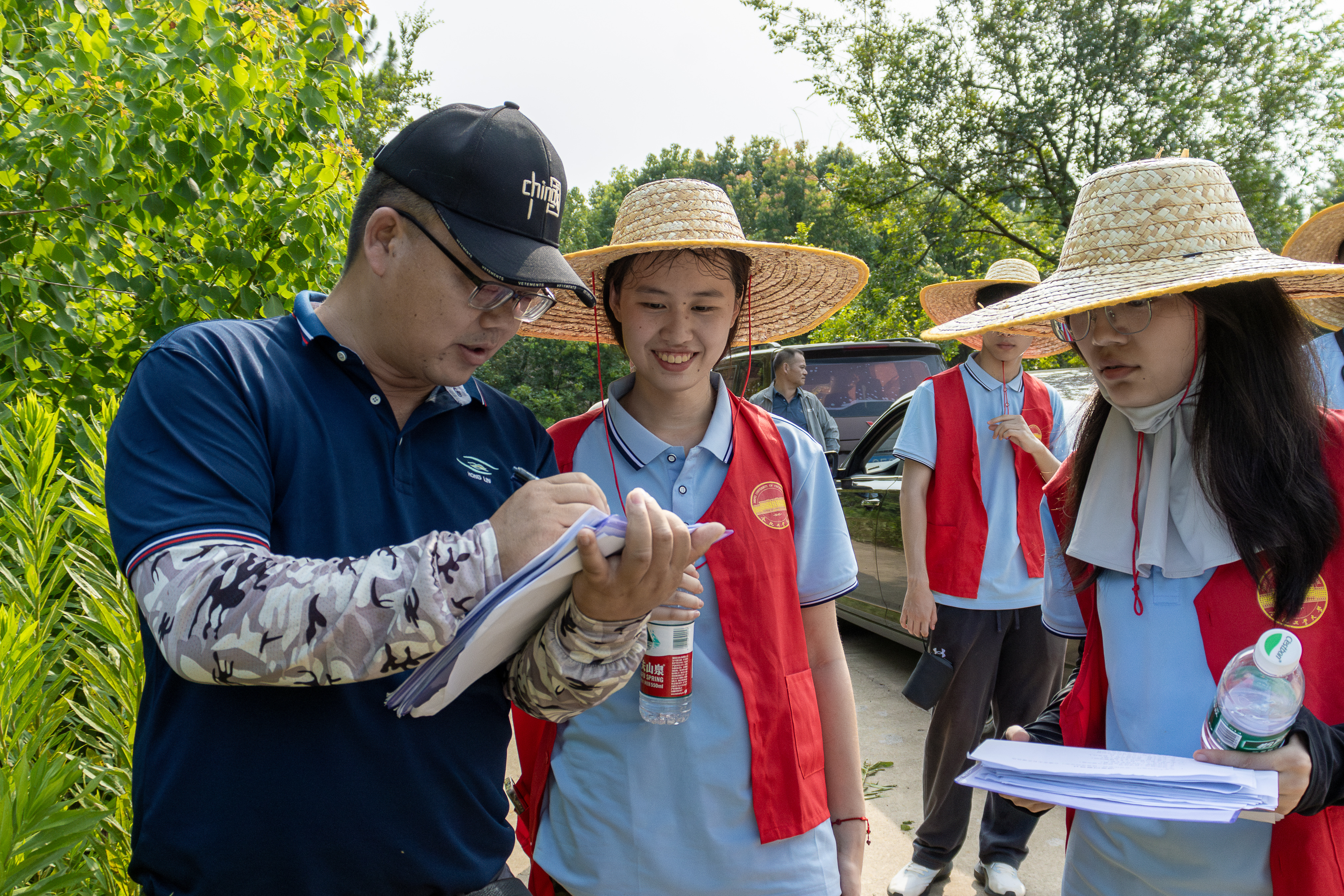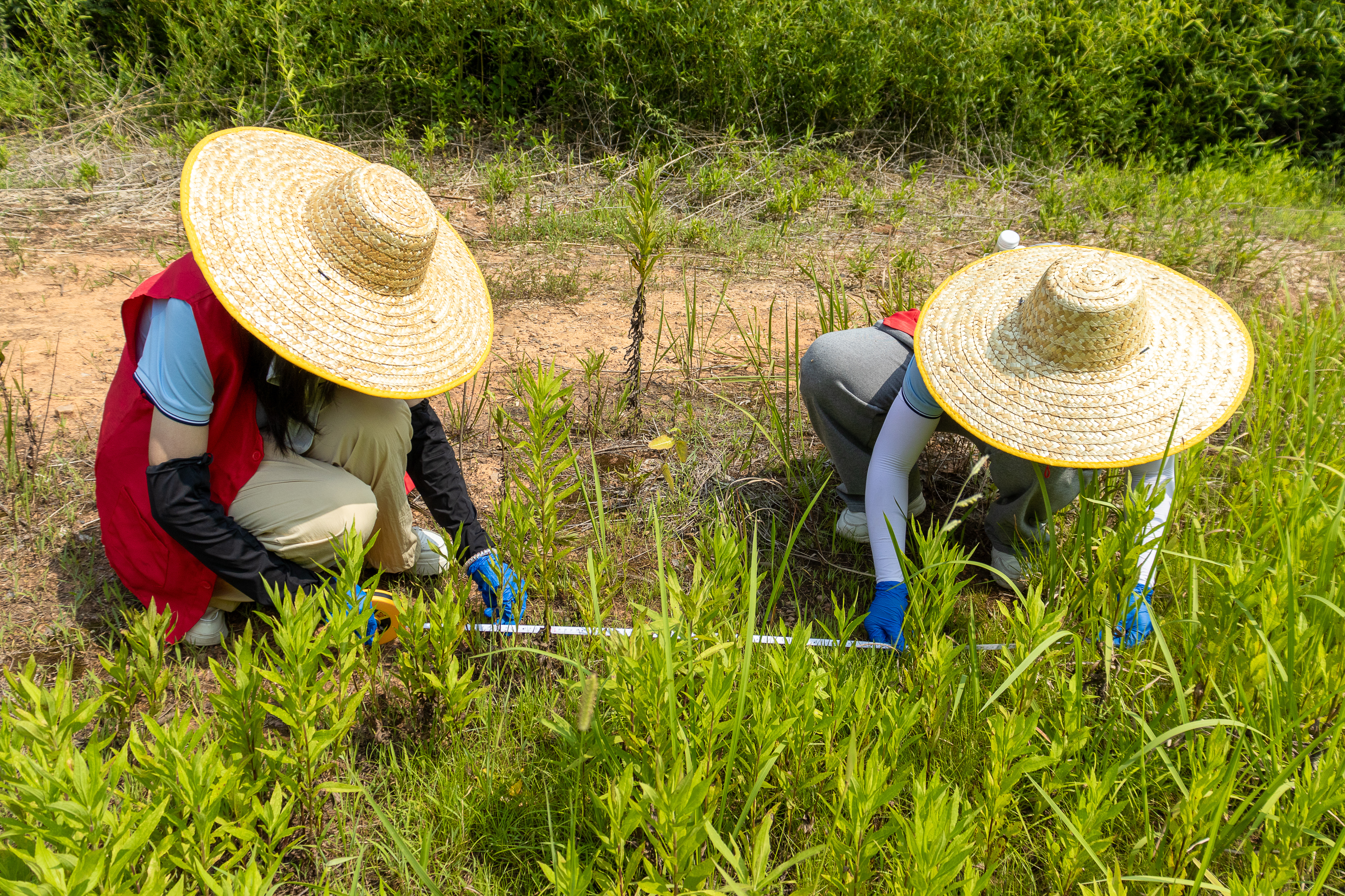 三村实地调研结束后,团队转战镇政府后山林带,扛起铁锹向板结土层发起总攻。一枝黄花的主根在土壤深处显露狰狞,沾满泥浆的测绳标记灭活深度。调研队顶着近40℃的高温,带着防护手套与草帽埋头在野外采样测量。豆大的汗珠顺着下颌滑落,滴在连根拔出的茎叶上,在烈阳下闪烁晶莹的光,田间湖泊亦倒影出佝偻着背的青年们的辛勤身影。