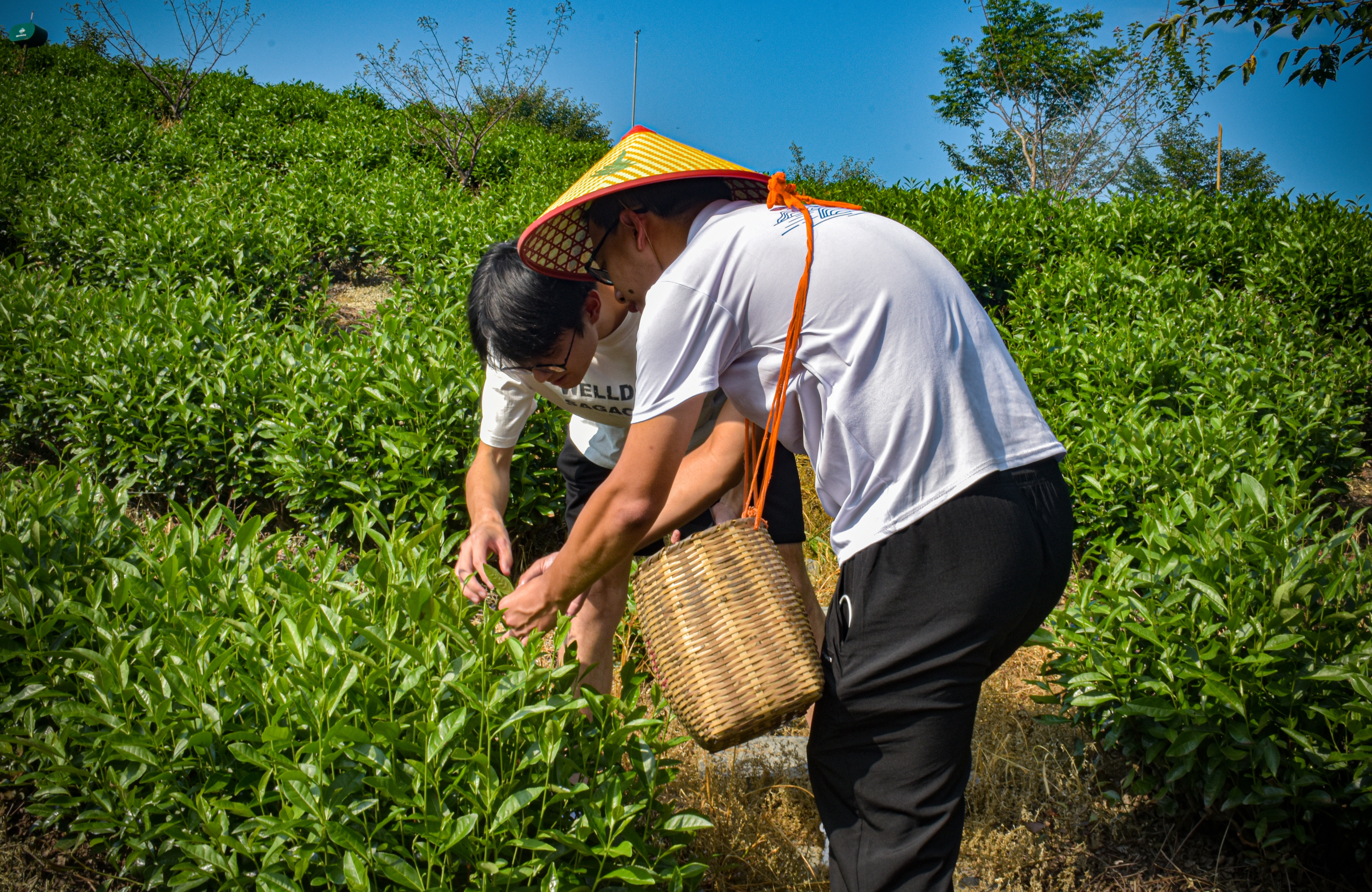 “我们采茶的时候采一芽一叶,在芽叶分叉下面一点掐下来”,茶园工作人员正在细致地指导实践队员们体验采茶工作,这座集茶叶种植、生产加工、文旅酒店、茶艺体验、综合培训为一体的茶园基地是当地白茶文化文旅融合发展的缩影。