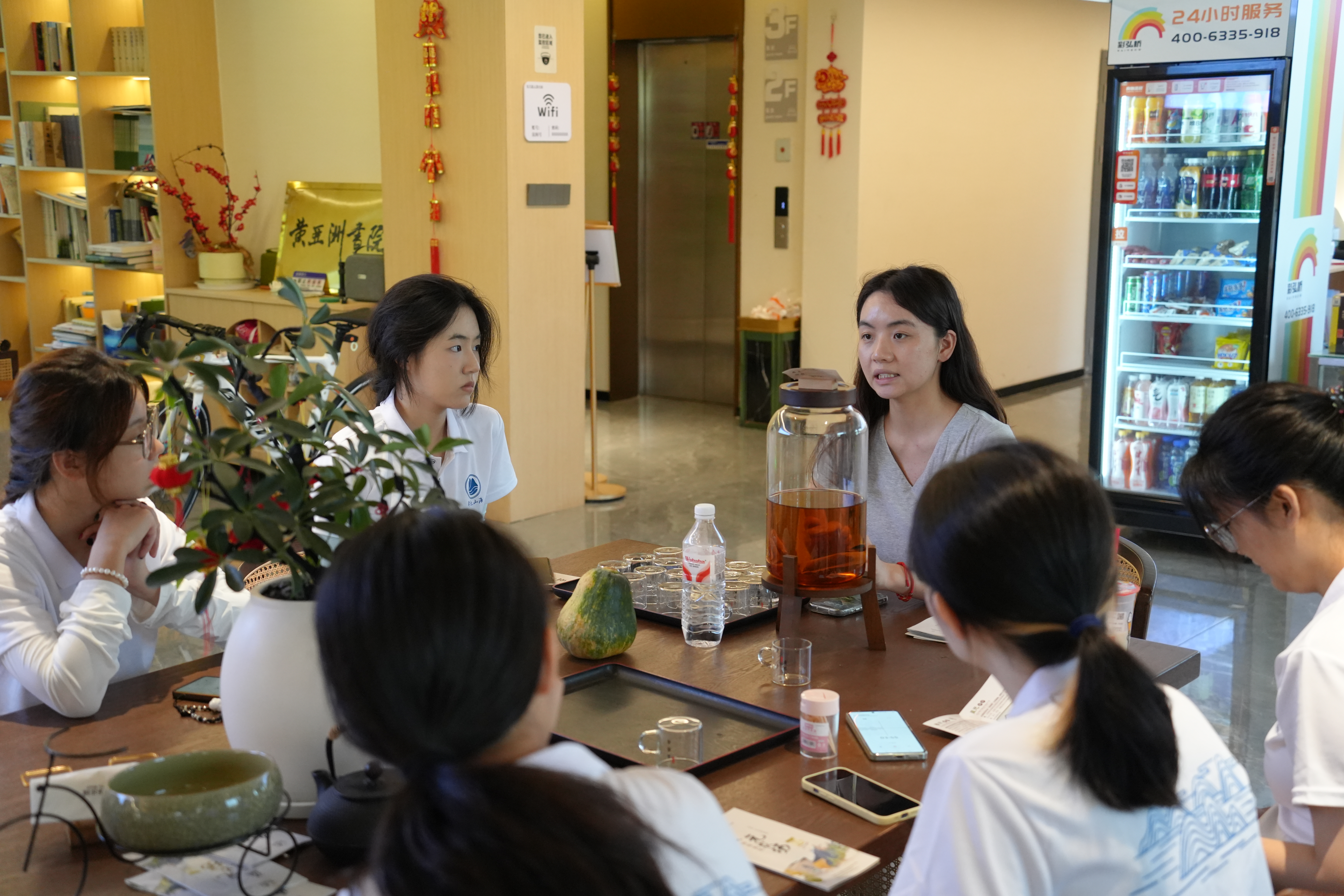 盈元农场主理人朱冰倩于2021年创办茶叶培训学校,培育白茶领域的高素质农民;打造茶文化展厅,通过文化赋能提升农场的综合竞争力;融合非遗手工制茶,提高产业的品牌价值。从种植到加工、从技能培训到文化传播,她一直在路上。而最近,她正在突破传统,培育适合长时间保存、易于冲泡、同时更符合大众口味的安吉红茶。长桌上,十一盏玻璃茶杯里盈着清亮亮棕红色的茶汤,实践队员们执起杯盏,轻嗅、微抿,在主理人的讲解下品味古老与新兴兼容并包的茶文化。