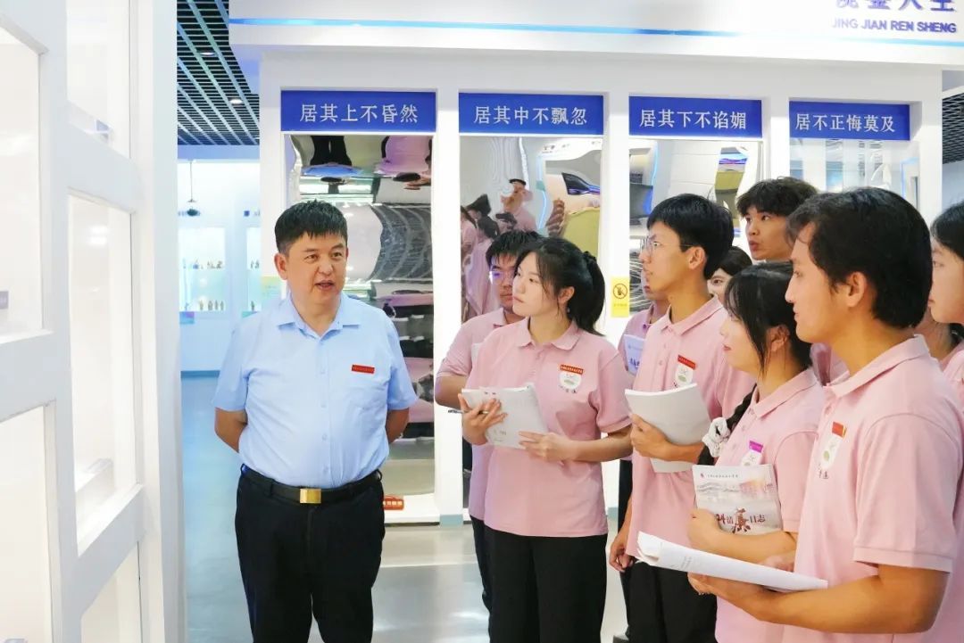 实践首站,南昌廉文化馆为队员开启“学廉”第一课。学校党委书记季强以“青莲”意象开篇,讲授了一堂沉浸式廉洁思政课。馆内的VR廉政体验、古今廉吏互动展陈,让“心若青莲,身正行远”的理念深深植入队员们心中。季强书记还巧妙地将陶瓷工艺与廉洁要求相结合,他讲到:“景德镇匠人‘过手七十二道方成器’,道道严谨,正如同党员干部需千锤百炼,方能铸就‘拒腐蚀永不沾’的政治本色。”在此,青莲之“净”与匠心之“精”交融,为学子烙下深刻的廉洁“第一道釉彩”。