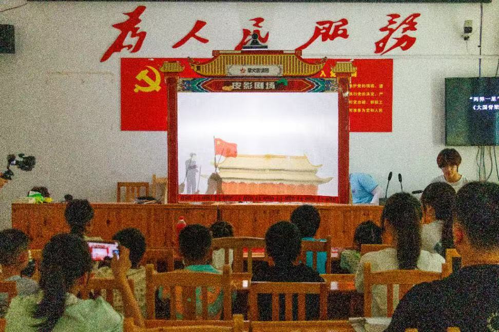 实践队走进邵阳市绥宁县长铺子苗族侗族乡佘家村,将“红色皮影”展演搬进苗乡侗寨。从《朱德的扁担》到《伟大的转折:遵义会议》到《大国脊梁:邓稼先》,红色故事在皮影光影中展开,以灵动的皮影造型、铿锵的唱腔,生动诠释了共产党员的忠诚与担当,孩子们瞪着眼睛看得入神。这些红色剧目像一颗颗火种,在苗乡侗寨的乡村土地上点燃红色火焰,让红色故事借着光影在乡村中闪闪发光。