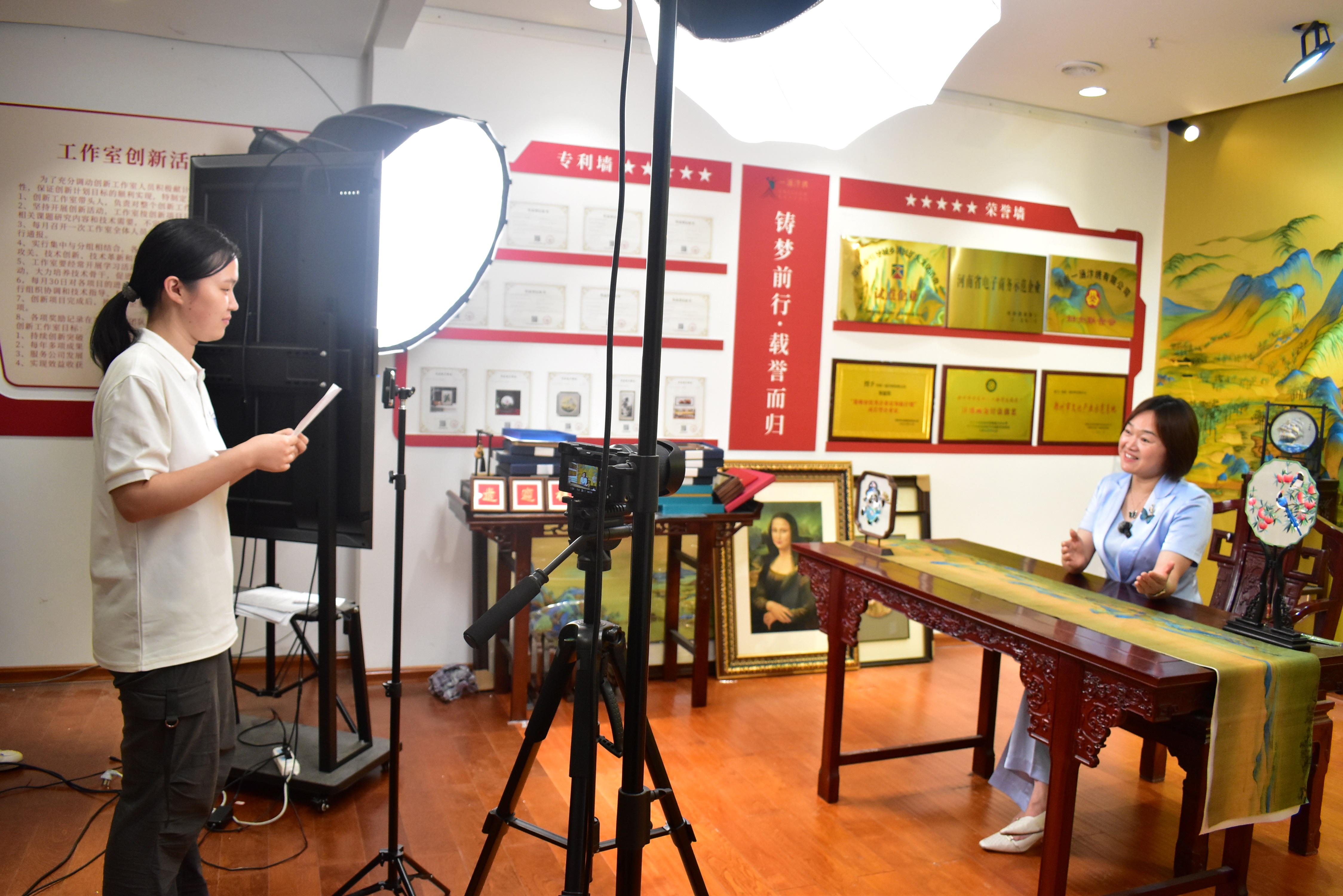 图为实践队成员就一涵刺绣博物馆和产业学院创办的初衷及汴绣国际化的实践等问题采访“全国巾帼建功标兵”张留凤。张明暖 供图