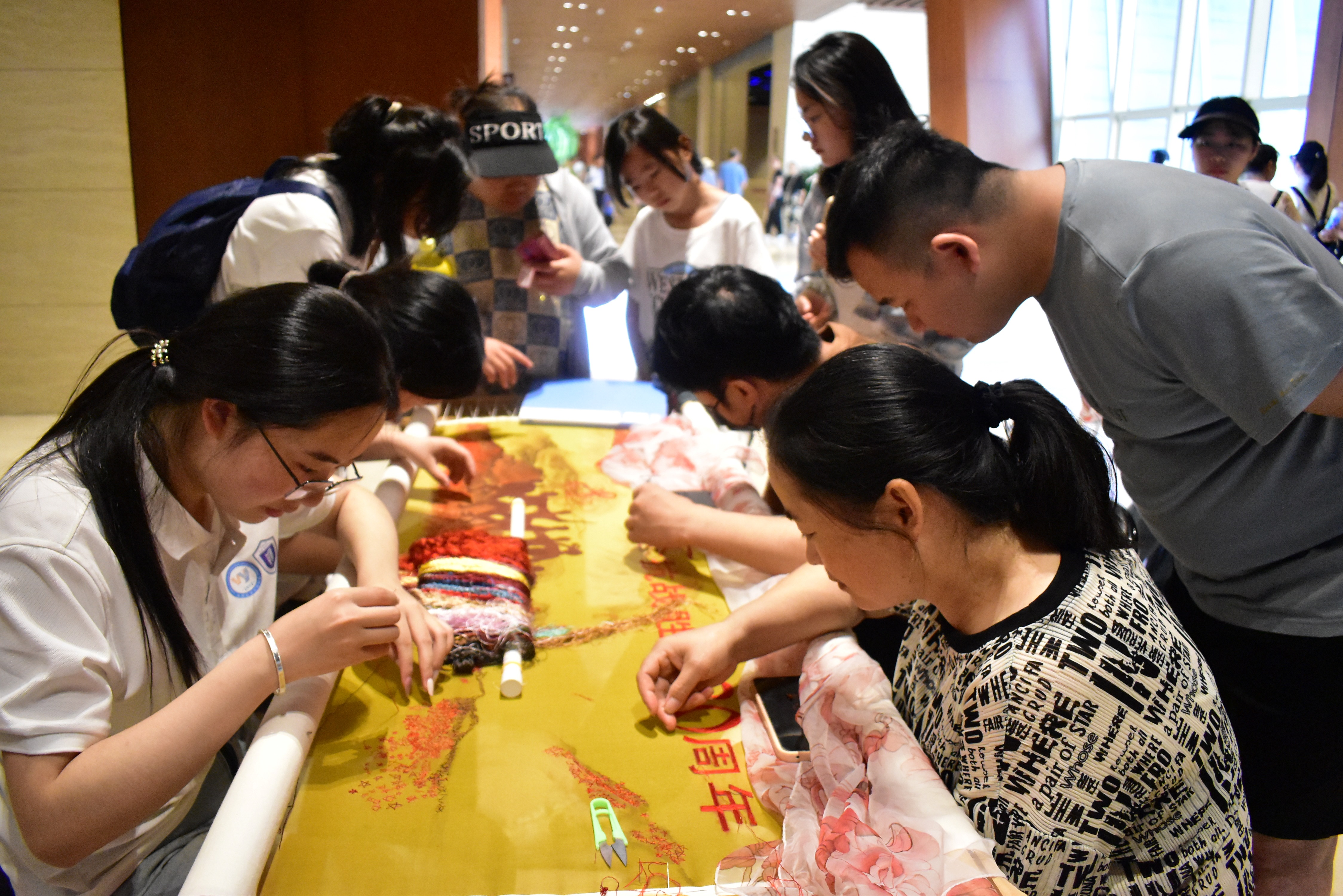图为实践队成员参与开封市博物馆组织的“纪念抗战胜利80周年 革命精神永驻锦绣山河”汴绣作品共创活动,与现场群众共同绣制作品。龚雨帆 供图