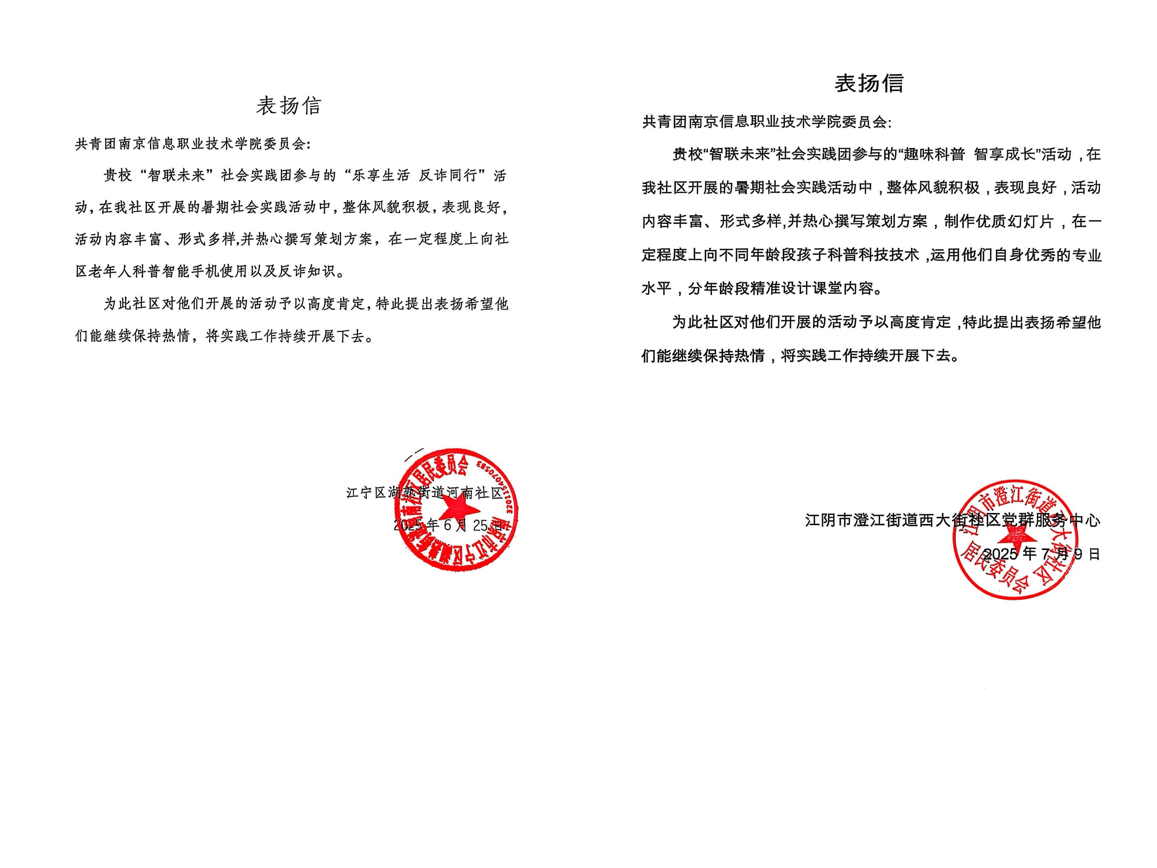 上图为南京河南社区与江阴市西大街社区的表扬信
