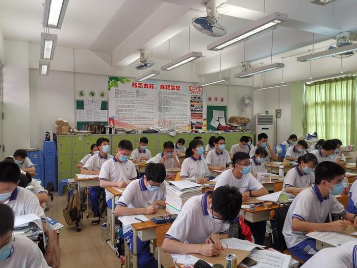 考前最后这个周末,广州市第二中学高三年级16名党员教师自愿报名申请回校陪伴学生。在留校备考期间,高三年级每天根据不同的时段安排不同的学科老师对每个考生进行考前答疑、心理辅导,及时传递防疫的知识和要求。