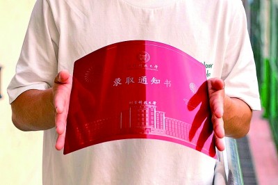 此后,我们又不断尝试将复合竹材的强度加强、将材料的厚度降低,实现了多种技术革新。例如,2020年,从竹基材的柔韧性和防霉技术入手,实现了录取通知书柔性强、可任意卷曲折叠,并且无毒、无害、防霉的特性;2021年,进一步增强了柔韧性和透光性;2022年,开始探索全国首款3D手工制作的竹制录取通知书……现在,我们的录取通知书制作过程中无废水、废液产生,采用改性淀粉胶黏剂,通过物理加工和手工3D制作,全过程绿色环保,充分体现了生态文明理念。