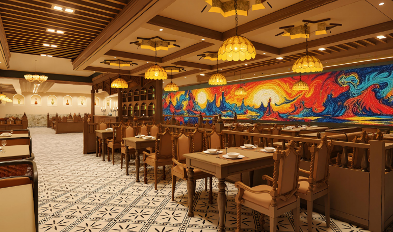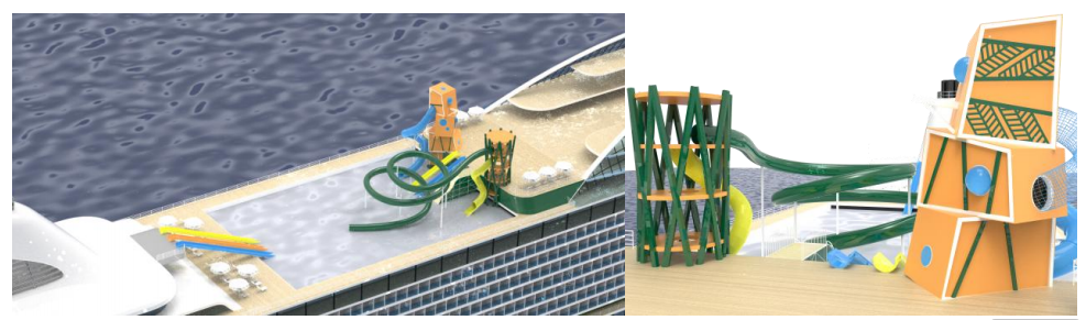 作品简介:作品以世界文化遗产“敦煌”为核心主题,将莫高窟壁画、鸣沙山月牙泉、阳关古道等标志性元素转化为可参与、可互动的实体娱乐设施,并结合数字光影技术打造昼夜交替的沉浸式演绎,旨在让宾客在碧海蓝天之间,亲身漫步于一座移动的“海上敦煌”,体验跨越千年的丝路艺术盛宴。