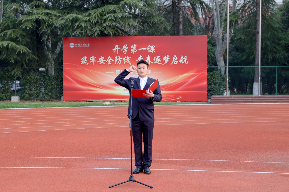 随后,学生代表机械工程学院2025级研究生蔡严己、计算机与信息学院2025级本科生付泽楷分别代领两校区同学们宣誓。现场学子高举右拳,庄严宣誓,承诺将自觉遵守校园安全规定,增强安全意识,筑牢安全防线,以青春之我、奋斗之我,为守护校园安全、担当时代使命贡献力量。