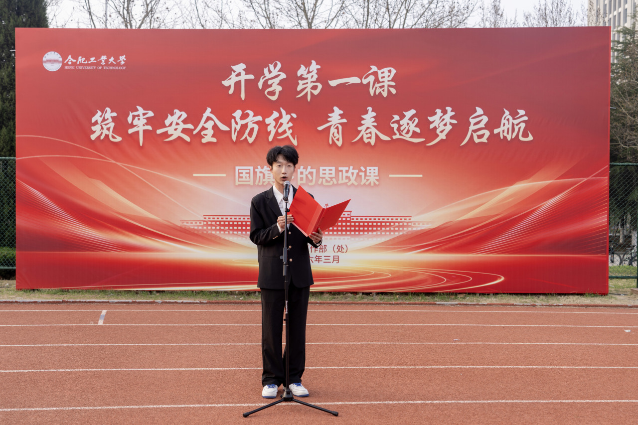 计算机与信息学院全国百佳心理委员、2023级本科生尹衍哲作国旗下发言。他号召同学们强化“安全即底线”的意识,既要成为网络空间的“清朗卫士”,也要当好实验室与宿舍的“安全哨兵”,以“时时放心不下”的责任感,主动识别风险、抵制隐患,在筑牢校园安全防线的实践中锤炼担当,为青春逐梦保驾护航。