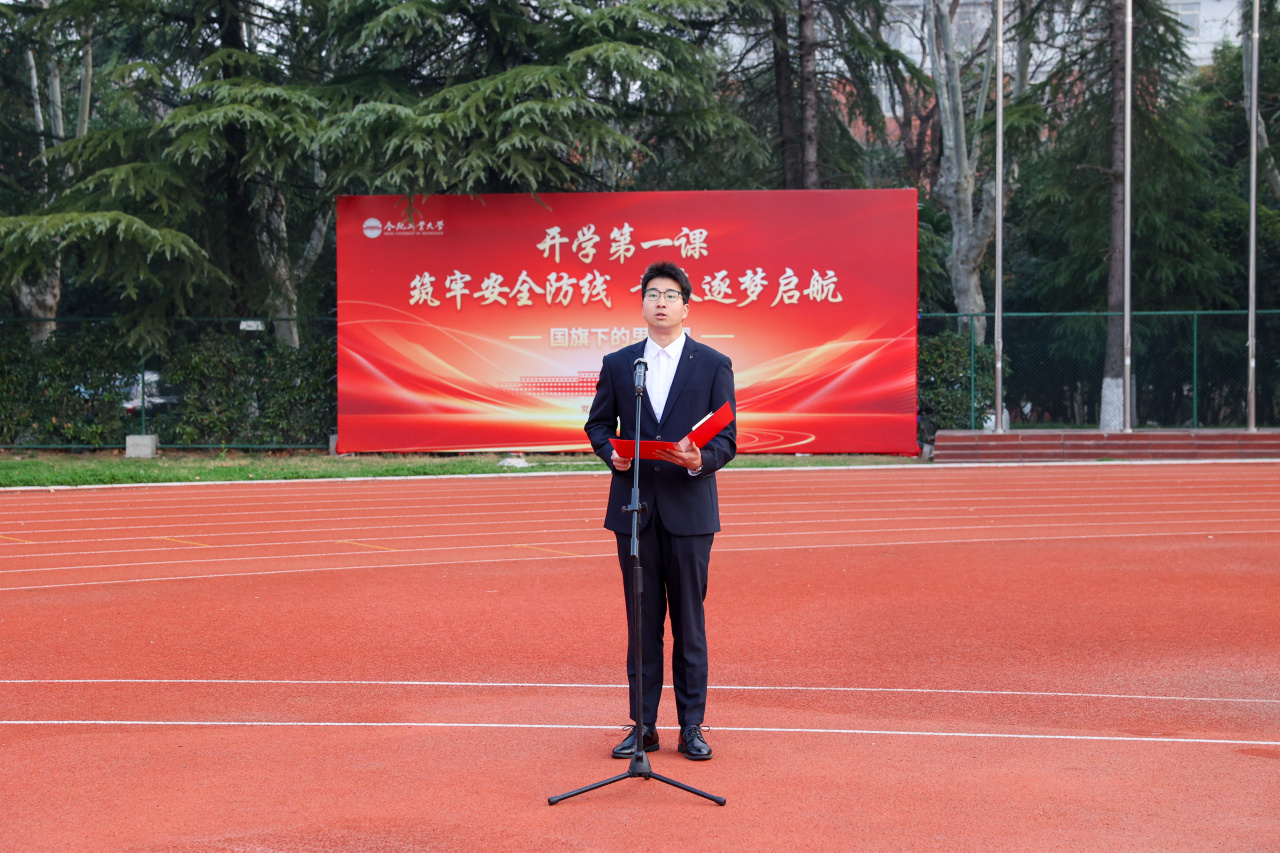 机械工程学院2023级研究生、国家奖学金获得者陆宽在国旗下发表演讲。他围绕“坚守安全底线,谱写青春华章”主题,号召大家树牢安全意识,关注身心健康,提升网络素养,共同守护安全环境。