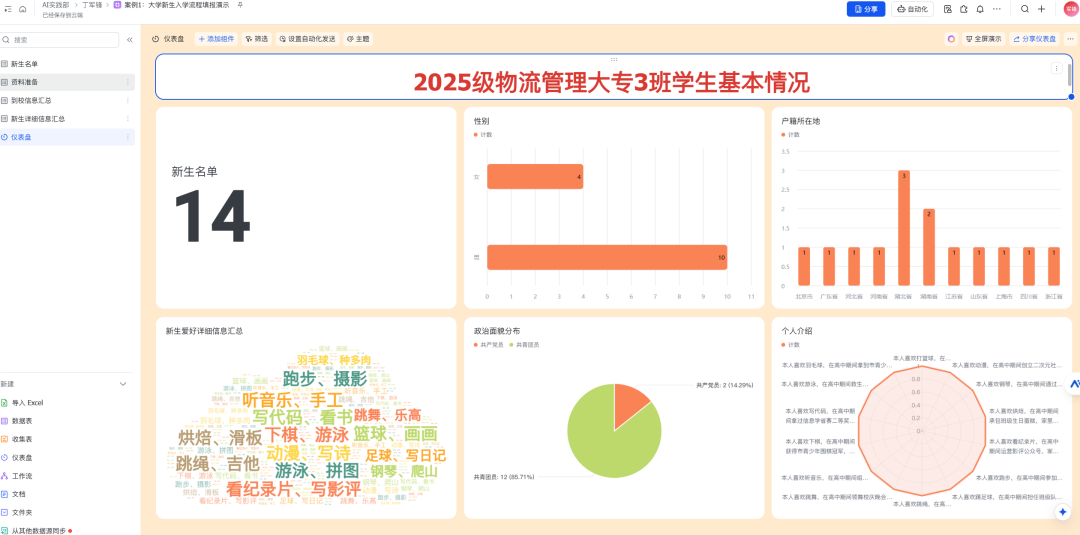 构建学生画像是实现个性化辅导的基础。飞书多维表格支持设计全面的学生信息字段,包括基础信息、教育背景、兴趣爱好、性格特征等多个维度。通过表单视图收集数据后,辅导员可以利用仪表盘功能生成可视化分析图表,快速识别特殊需求学生,如家庭困难或心理问题学生。这种数据驱动的学生画像,为制定个性化辅导方案提供了科学依据。