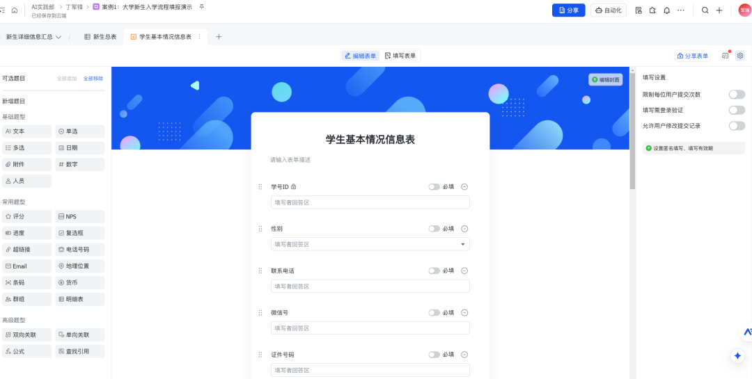 场景痛点:新生入学信息收集是辅导员面临的第一个挑战。通过飞书表单功能,辅导员可以快速创建信息收集表单,设置必填项和分组选项,学生扫码即可填写。系统会实时汇总数据,并按到校日期自动分组,辅导员可以随时掌握报到进度。这种方式不仅提高了效率,还避免了传统纸质登记易丢失、统计耗时的弊端。
