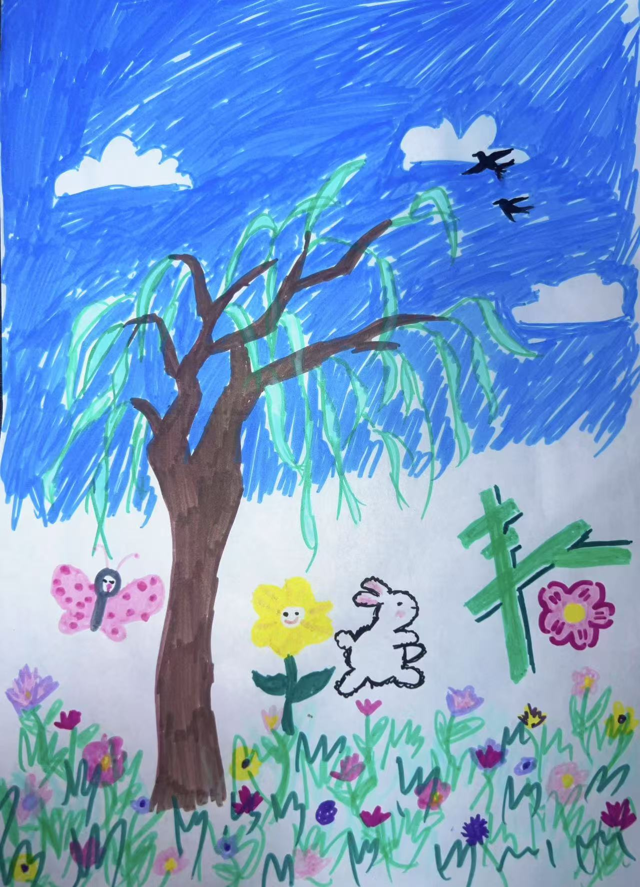 这幅充满童趣的绘画,宛如一扇通往春日世界的窗口,将春天的盎然生机毫无保留地展现在眼前。