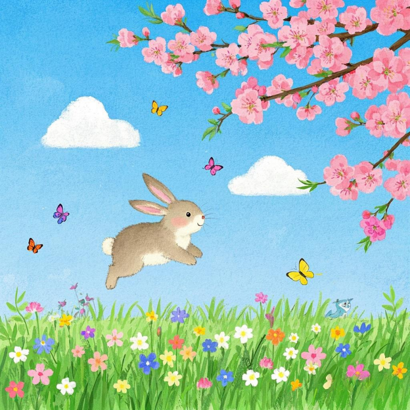 天空中,燕子轻快地穿梭飞翔,它们是春天忠诚的信使,跨越千山万水,带来温暖与希望的讯息。而地面上,五彩斑斓的花朵竞相绽放,每一朵都像是大自然精心雕琢的艺术品,红的热烈,黄的灿烂,粉的柔美,它们汇聚在一起,宛如一幅绚丽的织锦。花丛间,活泼的兔子欢快奔跑,蝴蝶蹁跹起舞,这一切构成了无比和谐而美妙的画面。