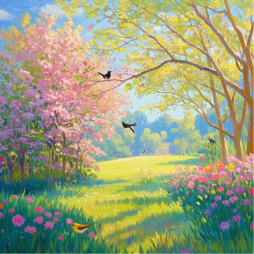 看着这幅画,我深刻地感悟到,春天不仅仅是季节的更替,更是生命的一次华丽转身。它是大自然给予我们的珍贵礼物,让我们在经历寒冬的沉寂后,重新拥抱温暖与希望。它提醒着我们,生活总是充满无限可能,无论过去多么艰难,都有重新开始、蓬勃生长的机会。我们应如这画中的万物,满怀热情地迎接生活的挑战,绽放属于自己的独特光芒,在时光的长河中,镌刻下充满希望与活力的印记。