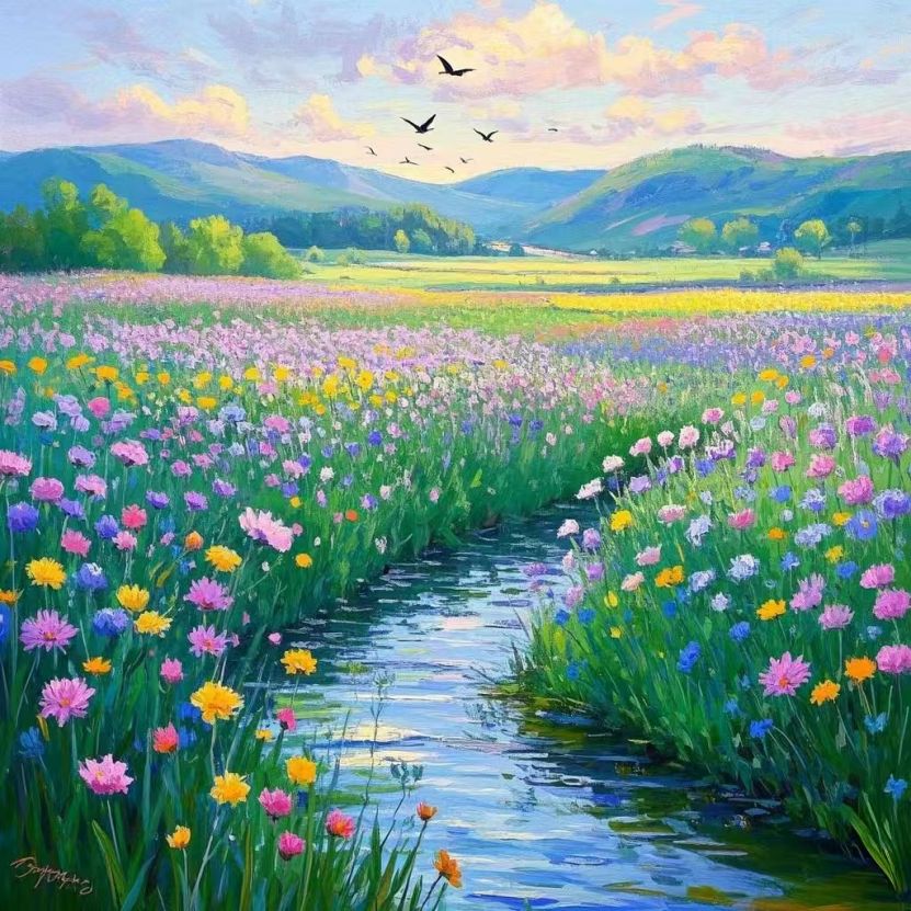 画作中的河流蜿蜒流淌,清澈见底,象征着春天的流动与新生。河岸两侧,绿草如茵,鲜花盛开,色彩斑斓,它们或高或低,或大或小,宛如春天的音符奏响着生命的乐章。这些自然元素共同构成了一幅美丽的画卷,让人感到春天的喜悦与希望。天空湛蓝如洗,自云悠悠,与宁静的河流,盎然的绿地形成了鲜明对比,营造出种远离尘嚣的宁静氛围。这种宁静与和谐,让人仿佛置身于世外桃源,忘却世间的纷扰。