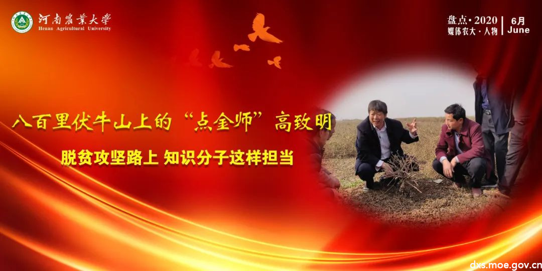 现年60岁的高致明,是河南农业大学农学院中药材系教授。多年来,高致明在河南嵩县、卢氏、方城、南召以及山东菏泽十余个县奔波指导,每年下乡培训5000余名中药材种植带头人,累计帮助带动数万家庭实现脱贫奔小康。作为河南中药学领域的领军人,高致明将毕生心血都投入到河南道地中药材研究,不仅为山区百姓送上“金饭碗”,还传授乡亲们“点金术”,让广大豫西山区贫困户依靠中药材种植脱了贫、致了富,真正将论文写在了崇山峻岭、写在了扶贫路上,被老百姓亲切誉为“八百里伏牛山上的‘点金师’”。