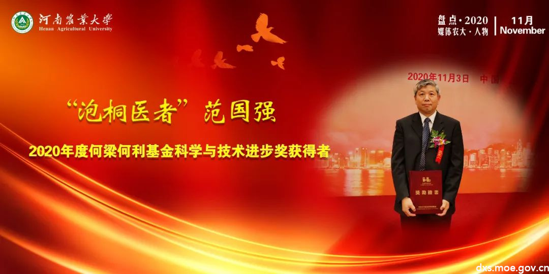 五年多时间,两次获得国家科技进步二等奖,他是河南省唯一一位。他就是我国著名泡桐专家、河南农业大学泡桐研究所所长范国强。11月3日,何梁何利基金2020年度颁奖大会对52名为中国科学技术进步与创新做出杰出贡献的科技工作者进行表彰,我校林学院范国强教授被颁授“2020年度何梁何利基金科学与技术进步奖”。范国强教授近30年来致力于泡桐生物学、泡桐抗性机理、泡桐种质资源创制与新品种培育及推广应用等方面的研究工作,在泡桐种质资取得了国际领先的创新性成果。范国强老师的科学精神、人文关怀和无私奉献,为全校师生们树立了榜样,为中原出彩奉献了自己的一份力量。