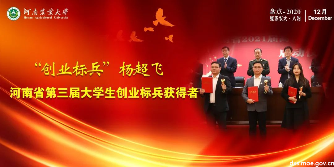 杨超飞,从2009年至2015年在我校经济与管理学院农林经济管理及农村区域发展专业完成了本科和研究生阶段的学习。2017年创办兰考坤禾农业开发有限公司,现任公司总经理。2019年荣获河南农业大学2019年度创业标兵。2020年12月15日,河南省2021届高校毕业生就业创业工作启动仪式在郑州举行,他凭借奋勉的创业精神和丰富的创业经历荣获河南省第三届大学生创业标兵。