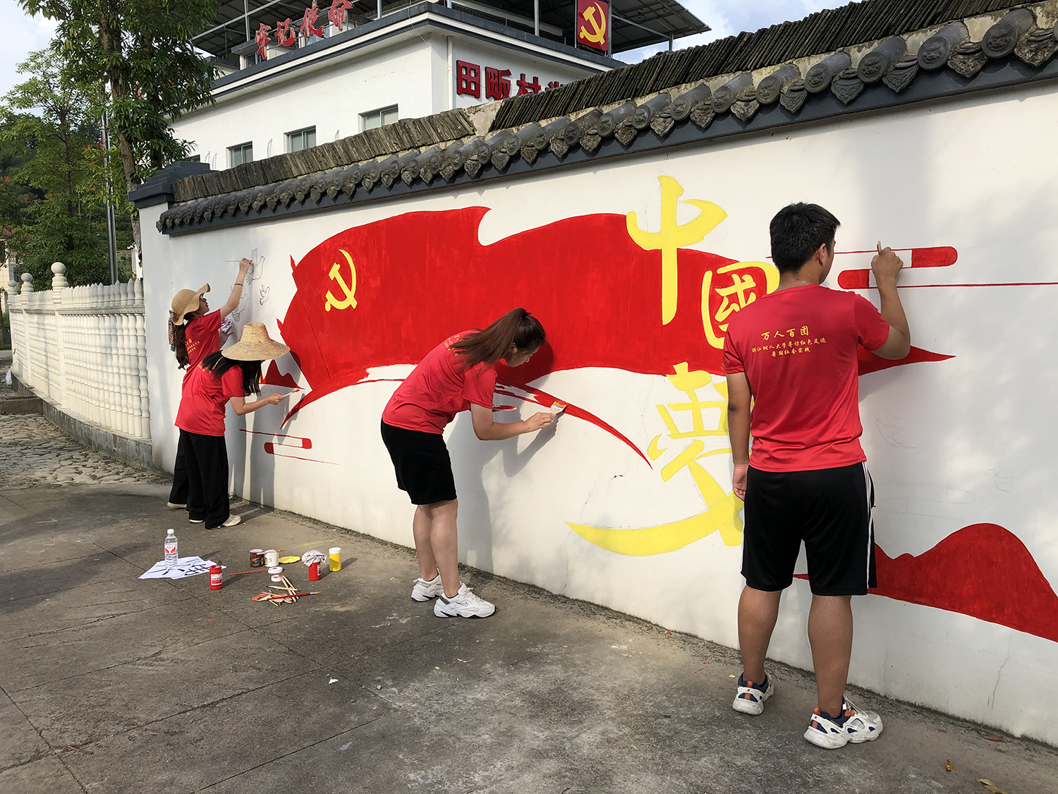 实践团师生们充分发挥专业特长,在党群服务中心绘制以“中国梦”为主题的党建文化墙。师生们发挥实干精神,团结一致,日夜作战,尽自己最大的努力以最快的速度完成墙绘的任务。“同心向党,礼赞百年。请党放心,强国有我!”学生们在自己的墙绘作品前高举队旗齐声宣誓,他们用自己辛勤的汗水为建党百年献上了一份特殊的礼物。