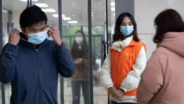 “请同学们戴好口罩,打开手机,排成一纵队往前走,会有志愿者引导大家入场。”首批前来接种的同学们从体育馆左侧入口排队有序进场,中途在志愿者引导下进行手机操作并测量其体温。经过这两个环节,同学们便可入场等候接种。