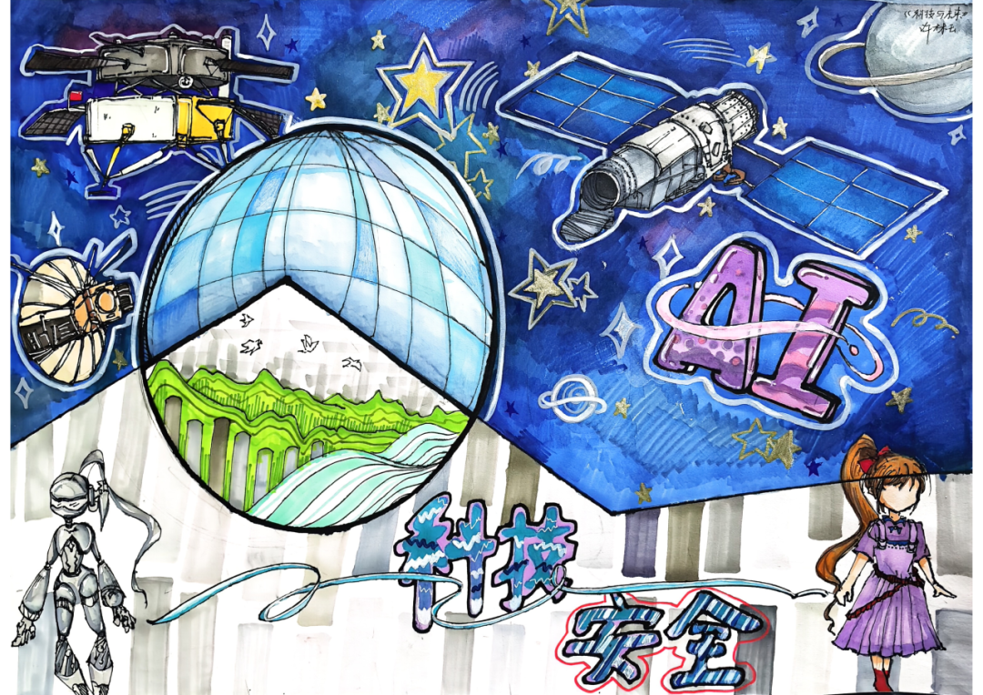 画作分为上下两个部分,上部分的画面展现了太空,有太空探测器空间站、星球,寓意科技的发展助力人类在太空上的进步;有天蓝色地球,和其他行星和星球,表现科技将赋予人类更多可能。下部分有机器人和一个人类女孩,有一条丝带联系,表现了在科学技术发展迅速的时代,人与机器人之间的关系需要关注,AI的发展是否出现负面影响。有一个地球表现大自然,反映科技与大自然的发展问题。背景使用灰色,是城市的抽象化表现。总而言之,该作品使用大量蓝,灰颜色表现科技发展的积极影响和潜在的负面影响,并与自然、人类、太空、城市等层面相关联,突出了科技安全这一理念在当今社会的重要价值。