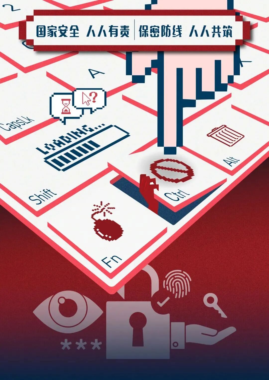 画面中融入了大量大众熟知的互联网符号:顶部的微信图标、底部的抖音图标,代表着我们日常高频使用的社交、娱乐平台,点明网络安全与每个人息息相关。