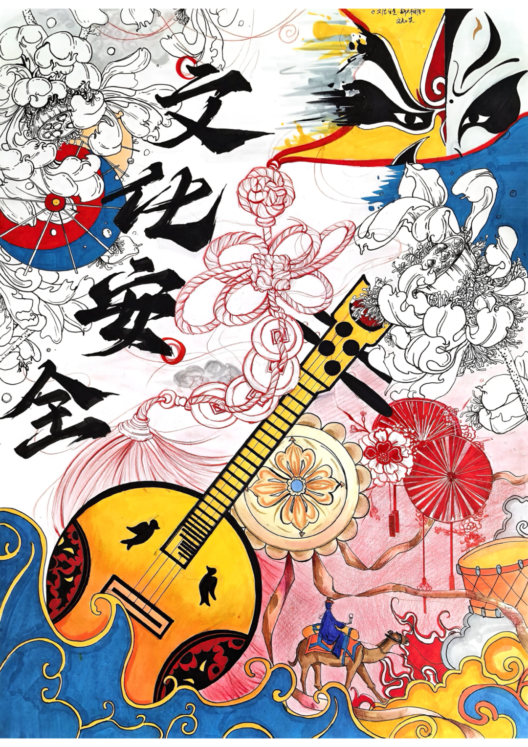 本作品以文化安全为核心主题,以插画为载体,融合中华传统文化符号,展现中华文化的传承和守护,传递文化自信与文化安全的时代内涵。“文化安全”点明主题,京剧脸谱代表中国传统戏曲文化,是中华文化的标志性符号,象征文化身份与文化认同;民族乐器元承载传统文化,寓意文化的传承与延续,是文化生命力的具象化表达;中国结象征团结与文化纽带,寓美中化华文化的凝聚力与传承的延续性;敦煌丝路元素代表丝绸之路文化交流,体现中华文化的包容性与历史底蕴,彰显文化安全的历史根基;油纸伞、鼓、传统纹样则补充民族民俗与工艺符号,共同构建中华文化的完整图景。以暖黄、采红、青蓝为主色调,传递文化的温暖与传承感,彰显文化的生命力与守护感,营造文化的厚重与深邃感,强化文化守护的主题,传递文化自信与文化安全的坚定信念。