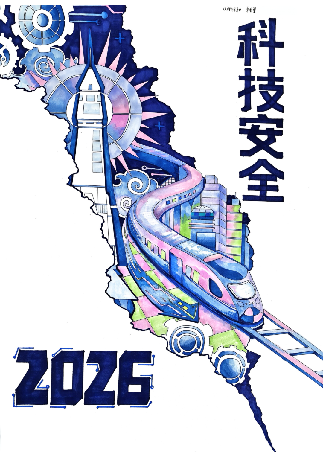 色彩上以蓝紫为主色调,蓝色代表科技、理性与未来,紫色传递创新与前沿感,搭配粉绿撞色丰富视觉层次,既契合科技主题的未来感,也营造出活力与安全感兼具的氛围。齿轮、电路等细节元素,强化科技属性与防护意象,凸显科技安全的硬核支撑。整体创作以未来感视觉语言,将科技发展、安全守护与时代坐标深度融合,传递出以科技安全护航高质量发展、奔赴2026新征程的时代精神。
