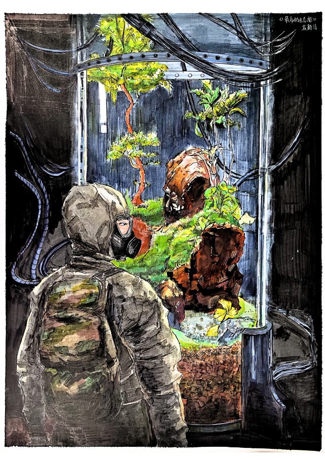 作品以“维护生态安全的未世启示”为核心构思,描绘了身着防护服的生态守护者在破败的科技空间中,凝视着一方被精心维护的人造生态舱的场景。画面核心符号紧扣生态安全主题:防护服人物代表坚守生态防线的守护者,厚重的防护服既暗示环境恶化的严峻性,也体现了人类守护生态的决心;生态航舱是生态安全的“火种”象征,舱内的绿植、岩石、流水构成脆弱却顽强的微型生态系统,对应现实中对自然保护区、濒危物种的守护;杂乱的管线与金属框架印证人类过度开发对生态秩序的破坏,传递出生态危机的压抑感。画面主色调为深灰与暗蓝,烘托生态破坏后的荒芜;生态舱内用鲜亮的绿、暖棕与浅黄形成视觉焦点,突出生态安全的珍贵。