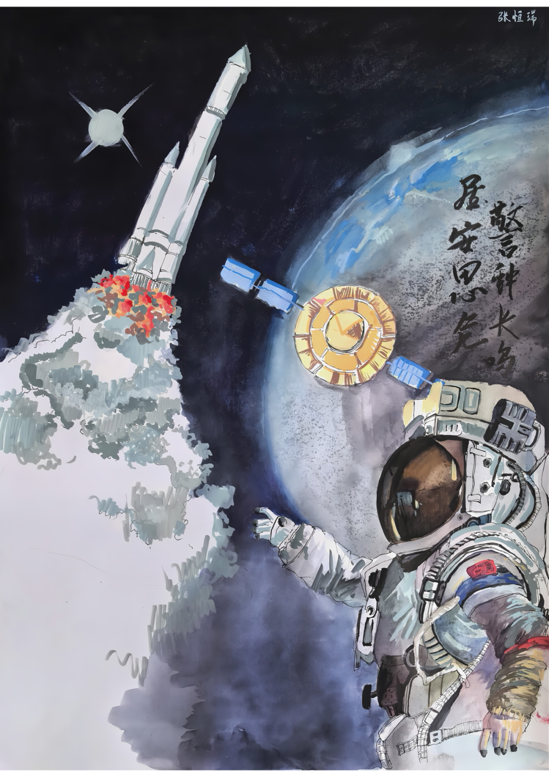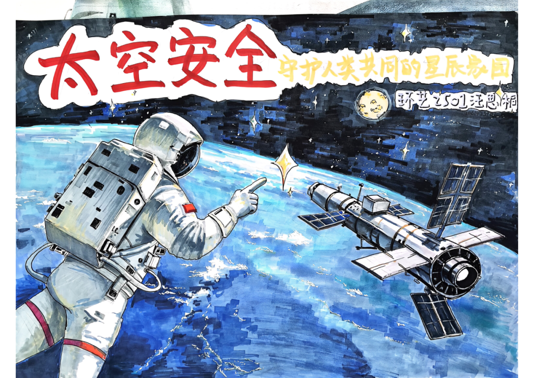 本作品以“太空安全”为核心主题,通过水彩与马克笔结合的手绘形式,构建了兼具视觉冲击力与思想深度的航天场景,传递“警钟长鸣,居安思危”的安全理念。画面以深邃宇宙为背景,左侧长征火箭喷吐烈焰升空,象征中国航天事业的蓬勃发展;右侧地球旁的人造卫星,代表太空资产的安全守护需求;右下角身着中国航天服的宇航员,以伸手的姿态呼应“守护”主题,臂章的五星红旗彰显国家航天力量。右上角“警钟长鸣,居安思危”的书法题字,直接点明作品主旨,提醒人们在航天事业高速发展的同时,必须时刻警惕太空安全风险。创作中,以冷暖对比强化视觉层次:火箭的炽热烟火与冷调宇宙形成对冲,凸显航天探索的激情与太空环境的严峻;宇航员的细腻刻画与火箭、卫星的写意笔触结合,兼顾细节真实与艺术张力。作品既展现中国航天的辉煌成就,更传递“发展与安全并重”的核心思想,呼吁全社会重视太空安全,守护航天事业行稳致远。