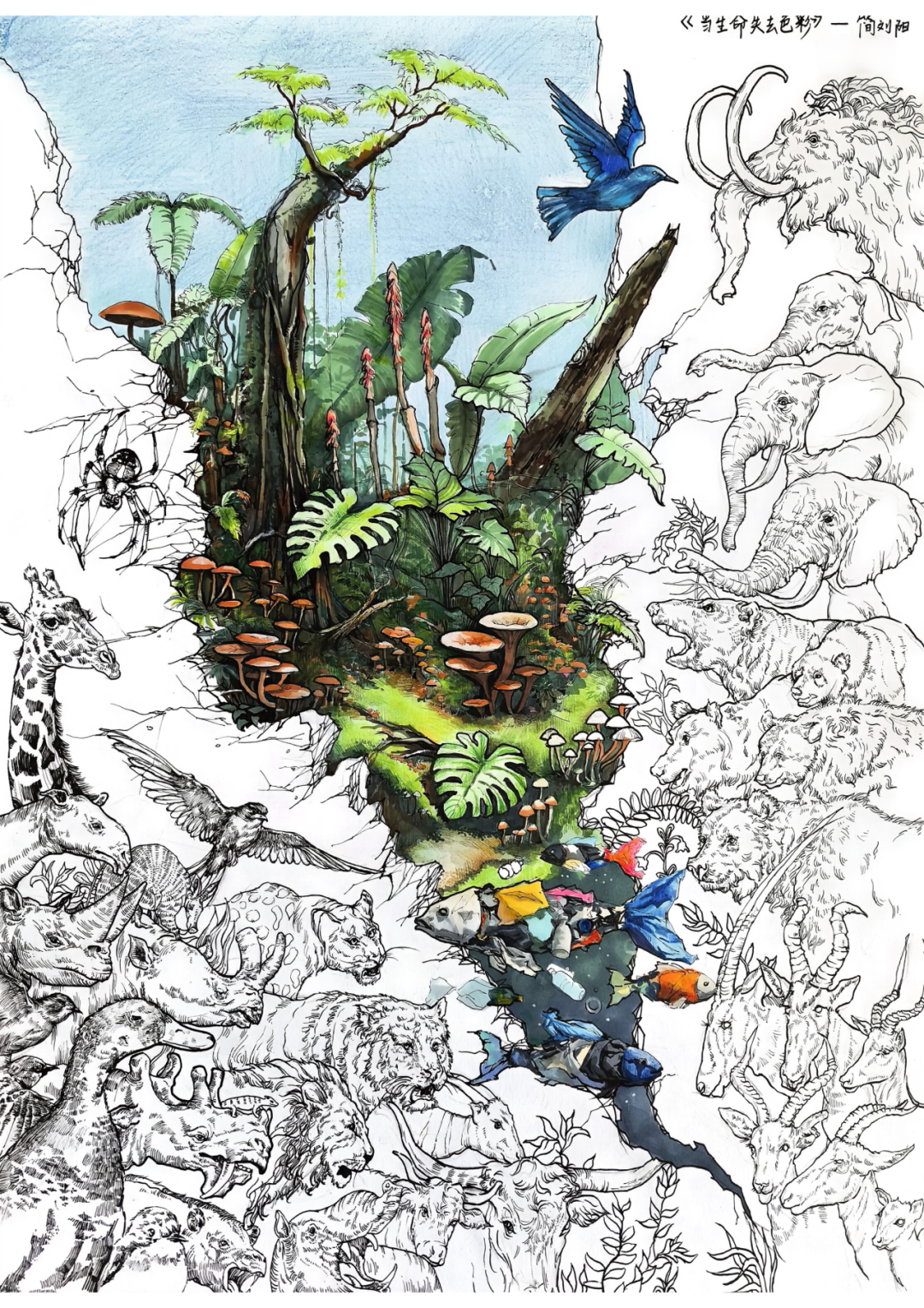作品以“生态安全”为主题,用色彩的强烈对比,呈现出自然生态的失衡与危机。画面中央的彩色雨林,是地球原本完整、生机盎然的生态系统。是所有生命的美好家园。雨林之外,是大量仅以黑白线稿呈现的野生动物,它们拥挤在绿洲边缘,象征着无数物种因栖息地破坏,环境恶化,失去了生命的色彩与语力,濒临灭绝。彩色雨林代表原生、健康的生态系统,是生命的底色。用“鲜活彩色”与“黑白线稿”的极致反差,凸显生态失衡的冲击;污染水域用暗沉杂色,直观呈现污染的危害。通过色彩的强烈对比,唤醒观者的生态保护意识,呼吁守护生态安全,守护每一个生命的色彩。