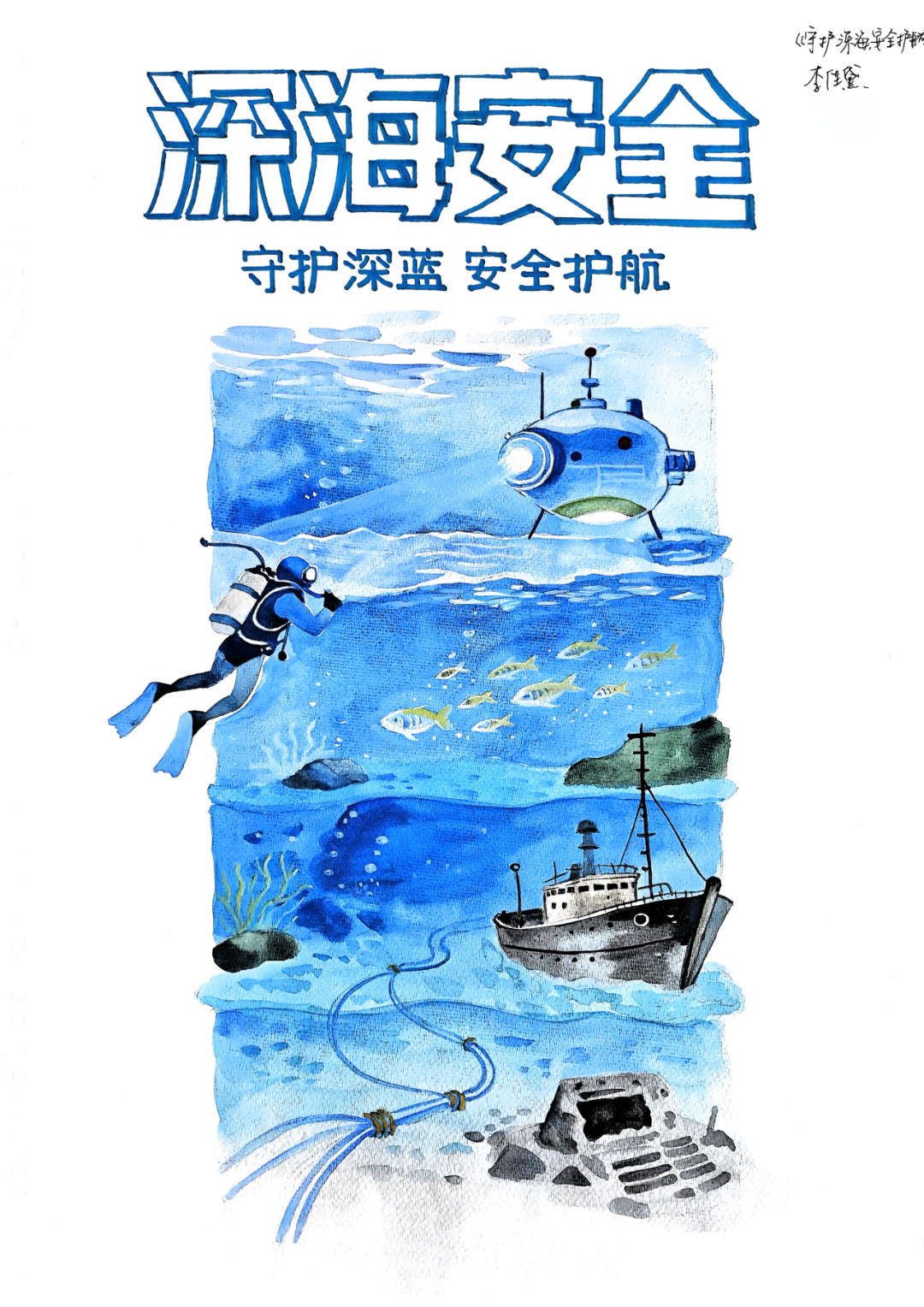(1)核心构思:采用三层垂直叙事结构,通过水彩画风构建深海沉浸式场景,直观呈现“探索监测一生态保护一资源保障”的深海安全维度,以柔和视觉语言传递专业守护的温度。