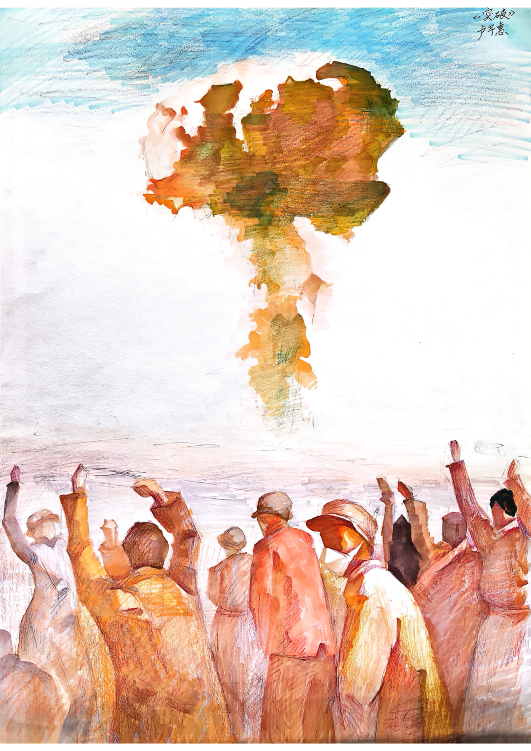 画面主要展现了我国第一颗原子弹成功爆炸时,大家一起欢呼雀跃,庆祝我国在核安全领域取得新的突破的场景。画面的人物构成多样丰富,有身穿传统民族服饰的当地百姓,有戴着口罩的科研工作者,有身着军装的军人,构成了画面的近景和中景,远景是原子弹爆炸后升起的巨大蘑菇云,场景壮观澎湃画面主色调是黄色调和红色调,以暖色为主,展现原子弹爆炸成功时大家激动洋溢的心情,也有欣欣向荣之意,同时增加了一种怀旧感,表达对老一辈科研工作者及广大劳动人民的敬意。画面中大多数人以逆光背影出现,画面右下角的视觉中心处的人物是一个回头看的科研工作者,也寓意着许多为科研事业付出的人都隐姓埋名,一心向着灿烂的太阳,向着下一次突破出发。
