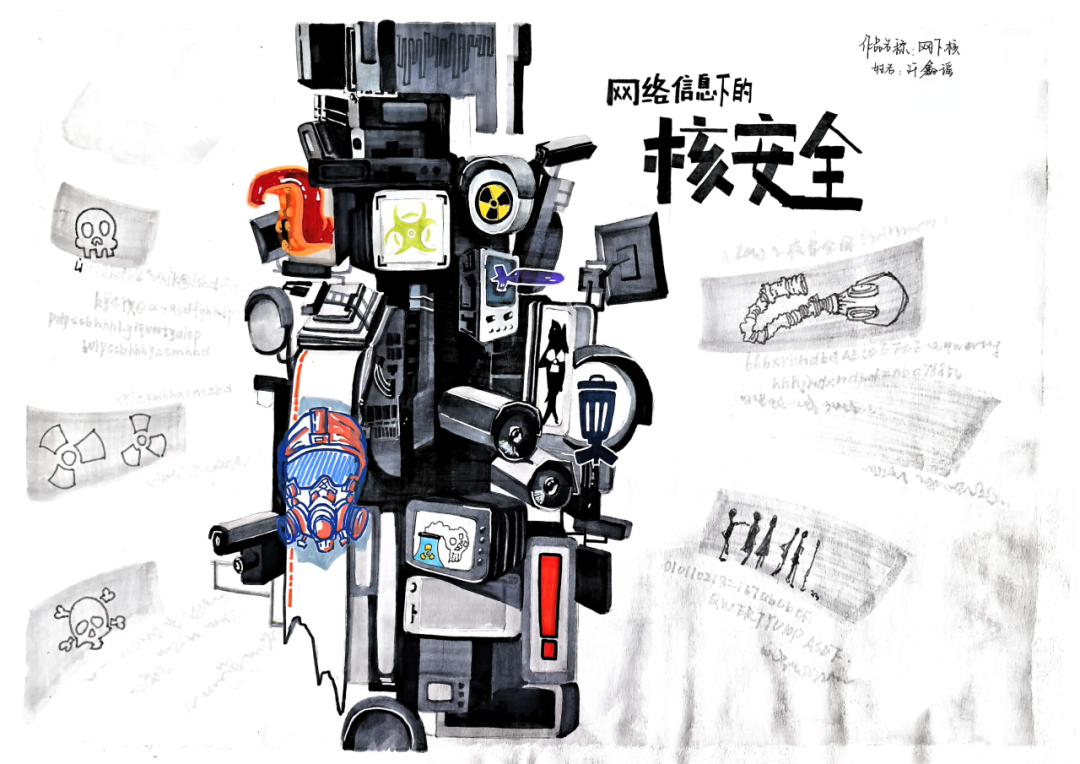 本作品以“网之核”为主题,通过具象化的视觉符号,解构数字时代核安全面临的多重风险。画面以堆叠的电子设备、监控摄像头、服务器等元素,构建出一个充满压迫感的“信息巨兽”,象征网络空间对核安全领域的全方位渗透与潜在威胁。作品融入核辐射、生物危害、防毒面具等警示符号,直观呈现网络攻击、信息泄漏可能引发的核安全危机;垃圾桶、黑客剪影等元素,直指网络谣言、恶意数据篡改对核安全体系的侵蚀。背景的辐射标识、骷髅图案与乱码,强化了信息失控带来的灾难性后果,传递出“核安全无小事,网络防线不可破”的核心主旨。