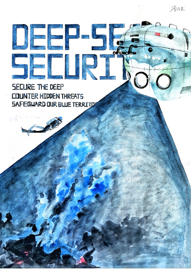 中心视觉符号是“奋斗者”号深潜器,其探照灯刺破黑暗,光束构成一道倾斜防线,象征科技是守护深海的核心力量。光内热泉口自然喷涌,展现深海资源的宝贵。