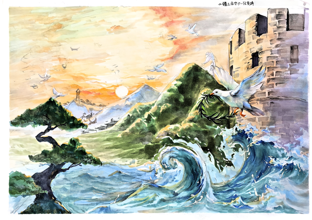 本作品以国土安全为核心主题,将三角、圆形等多种简单构图巧妙组合,构建出完整和谐的画面,暗喻国土的稳固、安宁与圆满。画面天际云彩合围形成凌空护盾形态,翱翔的和平鸽顺势围合出圆形构图,双重要素层层守护,既寓意全方位筑牢国土安全防线,又以圆形意象象征家国圆满、山河永安。作品以三角区域为视觉核心,青山承载祖国山河壮阔之景,古炮台彰显国人守护疆土的坚定信念,和平鸽与橄榄枝相伴,传递和平愿景,诠释守护换安宁的核心内涵。挺拔苍松扎根山河,象征坚守国土的坚韧风骨;山间哨所与村落相映,勾勒出值守护平安、家国享安宁的温暖图景。色彩上以暖金落日为主调,冷调山峦为辅色,冷暖交织尽显山河磅礴气势,既凸显守护温情,又彰显疆域防线坚不可摧。全篇紧扣“疆土永宁”主题,寄托着守护国土、祈愿国泰民安的赤诚信念。