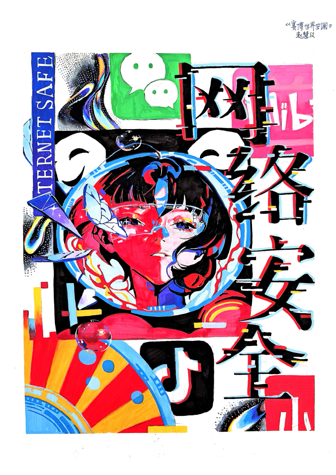 左半脸以热烈的红、橙为主,右半脸以冷调的蓝、白为主,形成强烈的冷暖对冲,隐喻网络世界中「真实自我」与「虚拟身份」的割裂,以及网络环境的双面性。少女佩戴未来感护目镜,搭配破碎感的冰晶装饰,既强化了赛博氛围,也象征着网络世界的「滤镜」与「伪装」,警示人们在虚拟空间中需保持清醒。