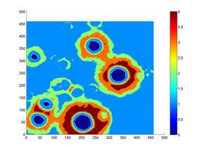 对于第二问,依据题意将其分为五个阶段。对于前两个阶段,建立天体力学分析中常用的二体模型及力学方程组,并对约束条件进行归一化处理。为了后续优化,列出全部归一化约束条件并建立目标函数,从而获得非线性规划模型。之后采用了序列化遗传算法对其进行筛选,从而逼近该阶段全局最优解,最终此阶段燃耗为1055.39kg。第二阶段同样属于复杂多变量优化问题,同阶段一建立优化模型并通过遗传算法求解该段全局最优解,最终燃耗为26.71kg。第三第四阶段主要在于图像处理与统计,第三阶段,通过对高程图进行K均值聚类分析,将图中像素点分为安全点与危险点,在对地图栅格化,并对方格内点类型统计取整,对方格二元化为安全格与危险格,在通过扩大寻找最大安全半径,综合考虑水平偏移量,建立合理的落点评价体系,最终找出最优点坐标(1275,1000),燃耗为86.97kg。第四阶段同样做聚类分析,并根据嫦娥三号实际体积选取合适的栅格大小,并对栅格通过最小二乘法对空间进行线性统计回归,求出平均坡面与平均坡度,结合最大安全半径建立最优落点评价体系,最终获得最优落点坐标为(88,56),燃耗为20.68kg。第五阶段最优燃耗为8.09kg。最后还讨论了简单运动的局部最优模型,简化了后几个阶段的运动学分析与计算。最终综合各段最优解,获得最优着陆轨道与控制策略。