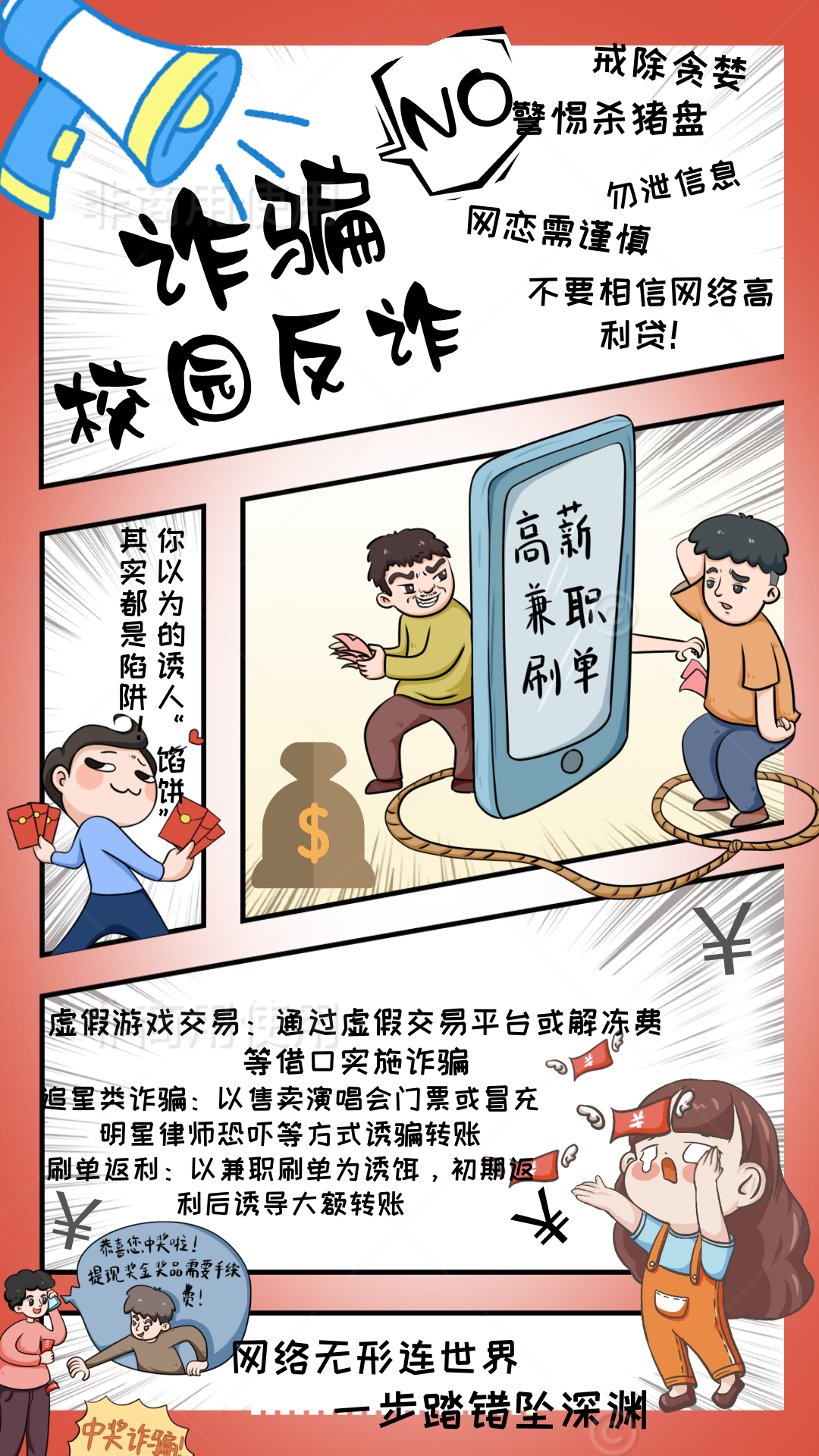 这是一副以校园反诈为主题的宣传漫画,通过生动的卡通画面和简洁明了的文字,展现了校园中常见的诈骗类型,入高薪兼职刷单、虚假游戏交易、追星类诈骗、中奖诈骗等旨在提高校园群体的反诈意识,守护财产安全。