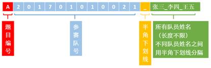例如:参赛队“201701010021”由“张三”、“李四”和“王五”三位队员组成,选做题目A,则该队的论文编号是:“A201701010021_张三_李四_王五”。论文编号的含义如图2所示。