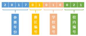 每一个参赛队均有唯一的参赛队号,即由12位半角阿拉伯数字组成:第1-4位为参赛年份(简称“年号”,由竞赛年份确定),第5-6位是赛区编号(简称“区号”,由全国组委会分配,见表2),第7-9位是学校编号(由各赛区组委会分配),第10-12位是校内编号(由所在学校分配)。例如:参赛队号201701010021的含义如图1所示。