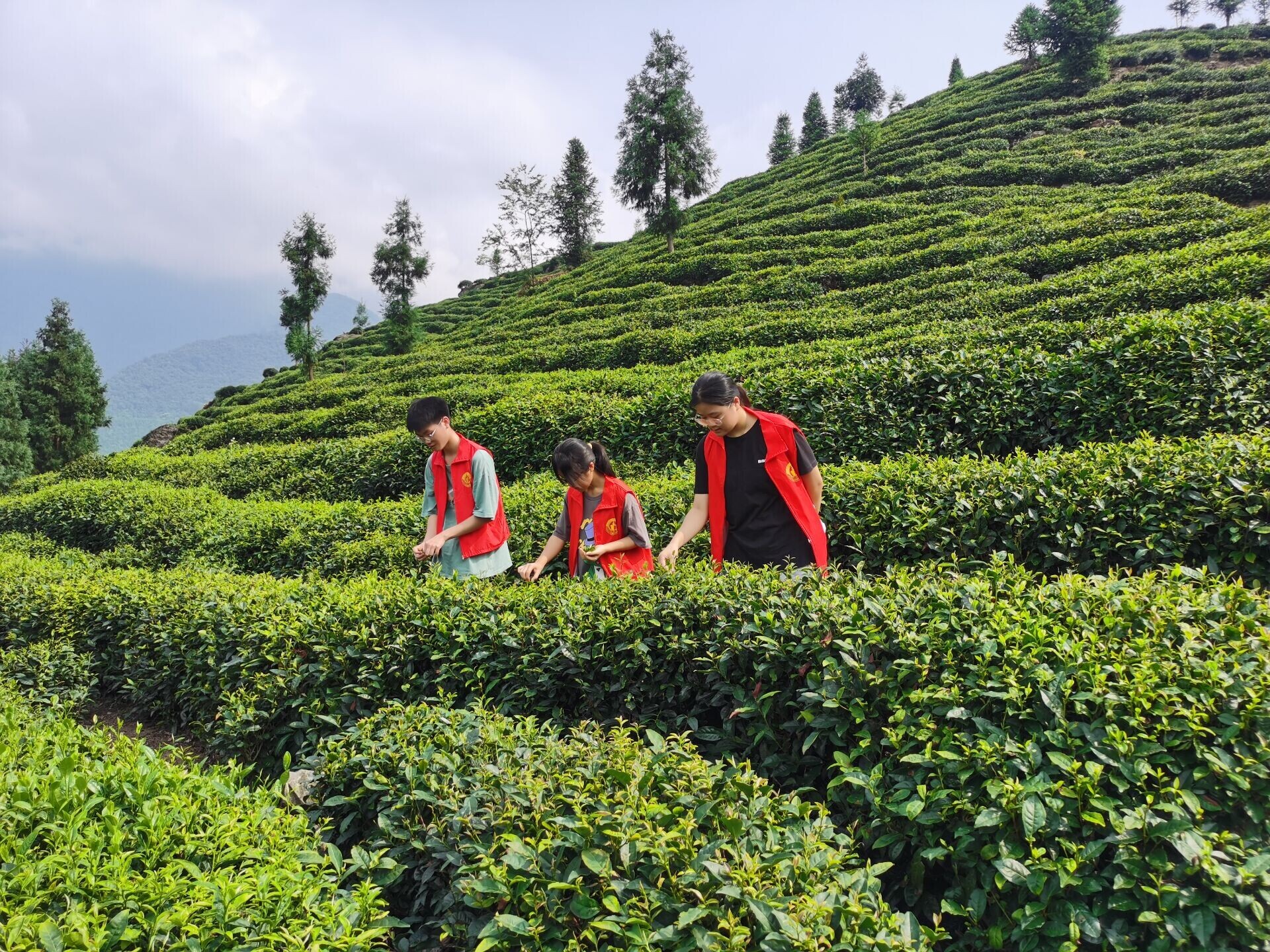 图为团队成员正在石龙门村茶园观察并采摘马边生态绿茶。 通讯员 邱咏康 提供