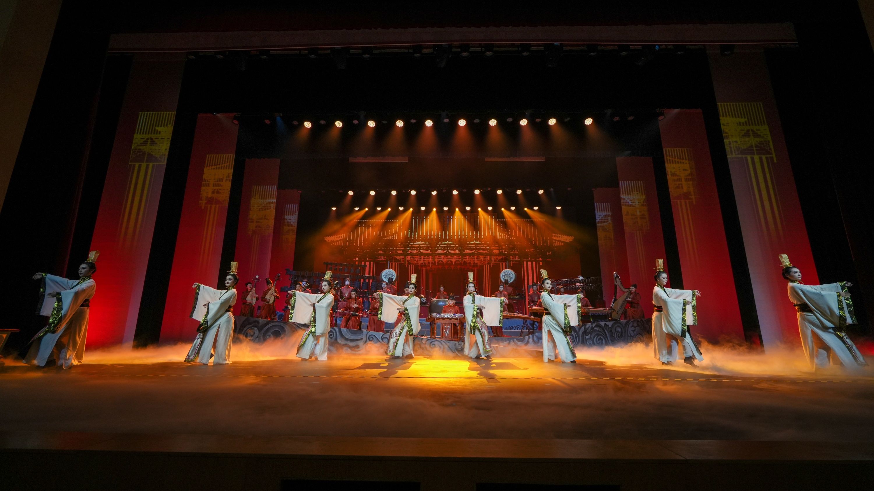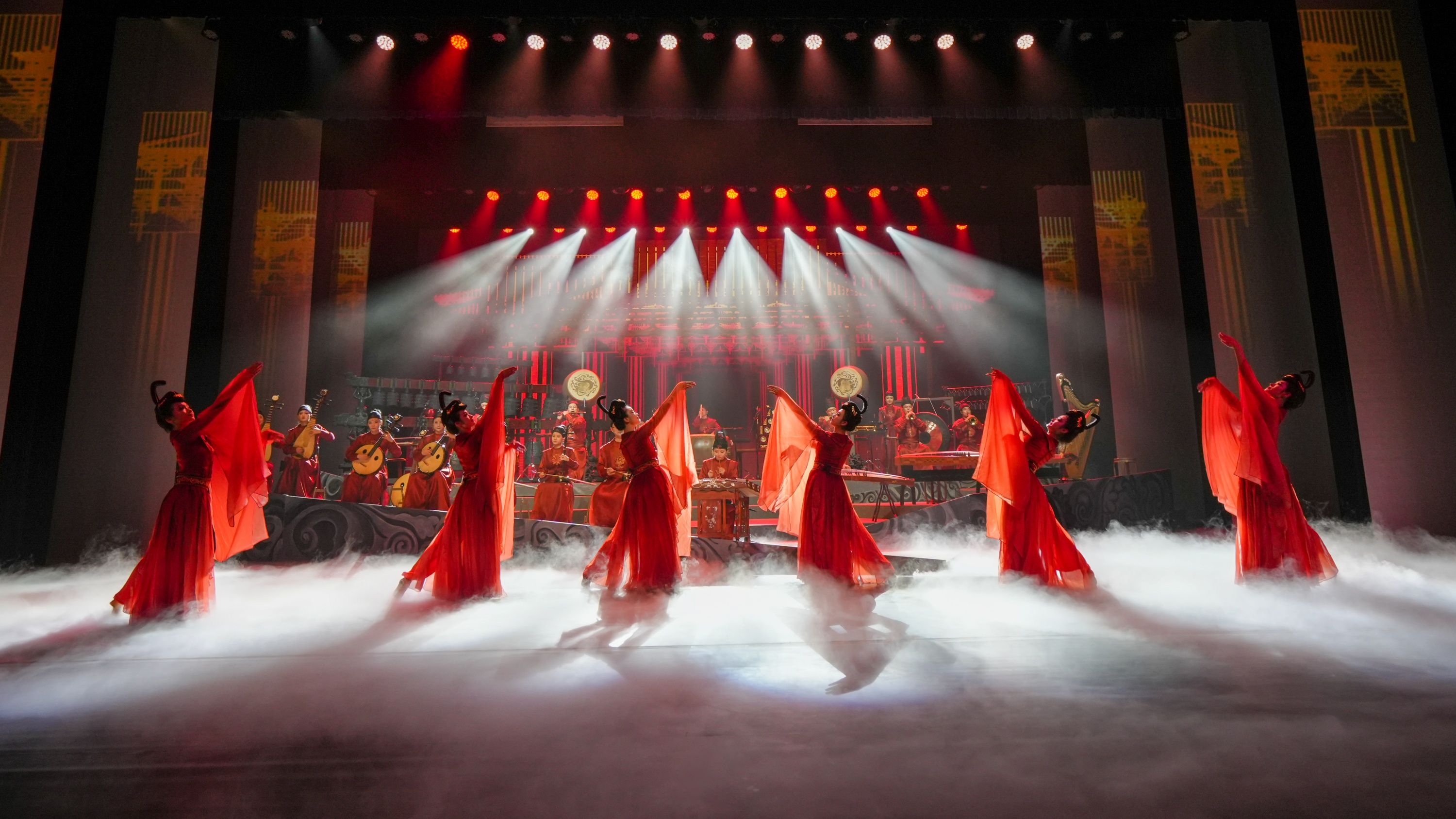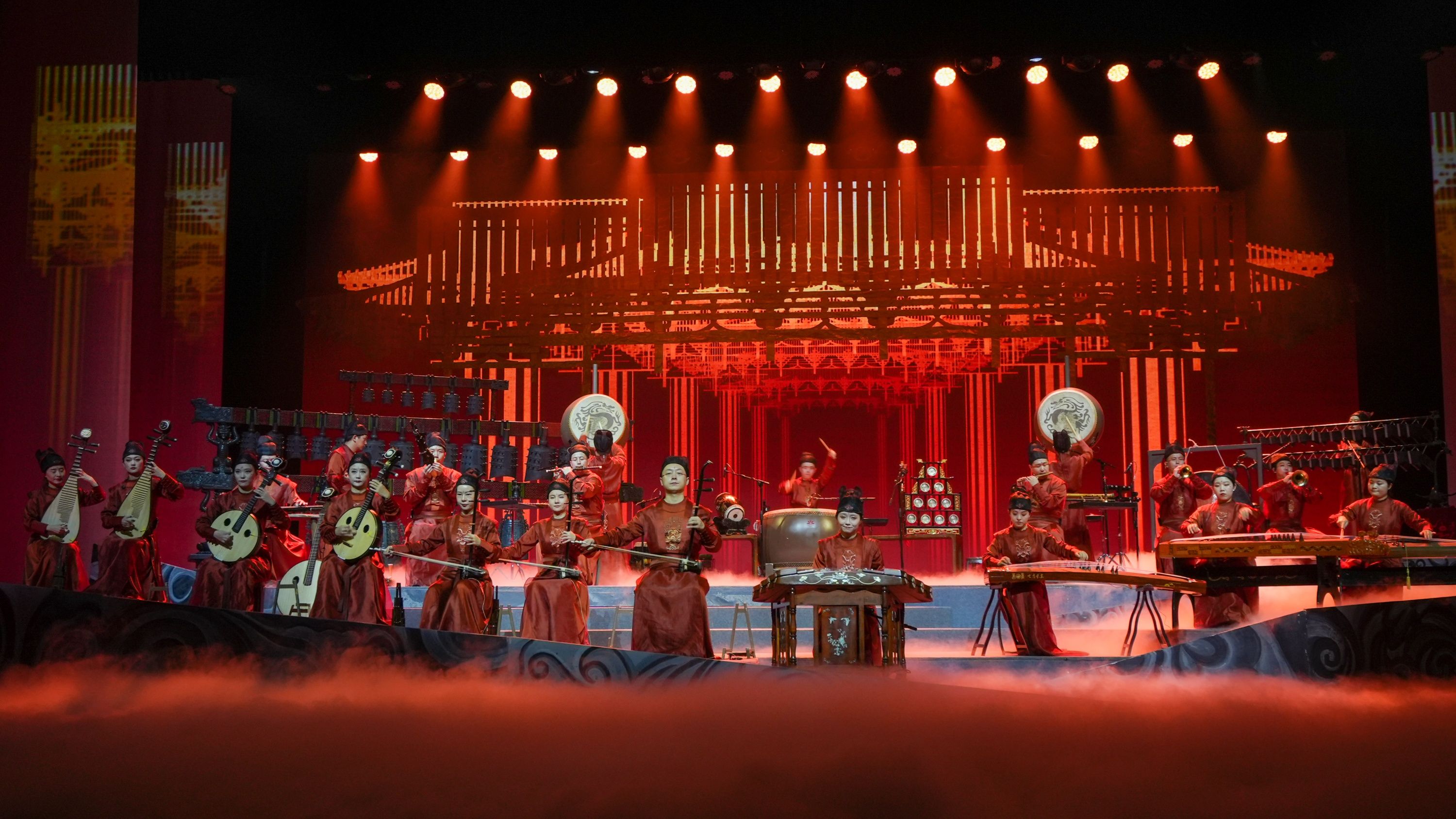 耳畔鼓声铿锵激荡,有编钟、编磬、古琴、瑟、古筝、箫、唢呐、阮、埙、琵琶等众多中国传统特色乐器和谐演奏,恍若盛唐音乐再现。