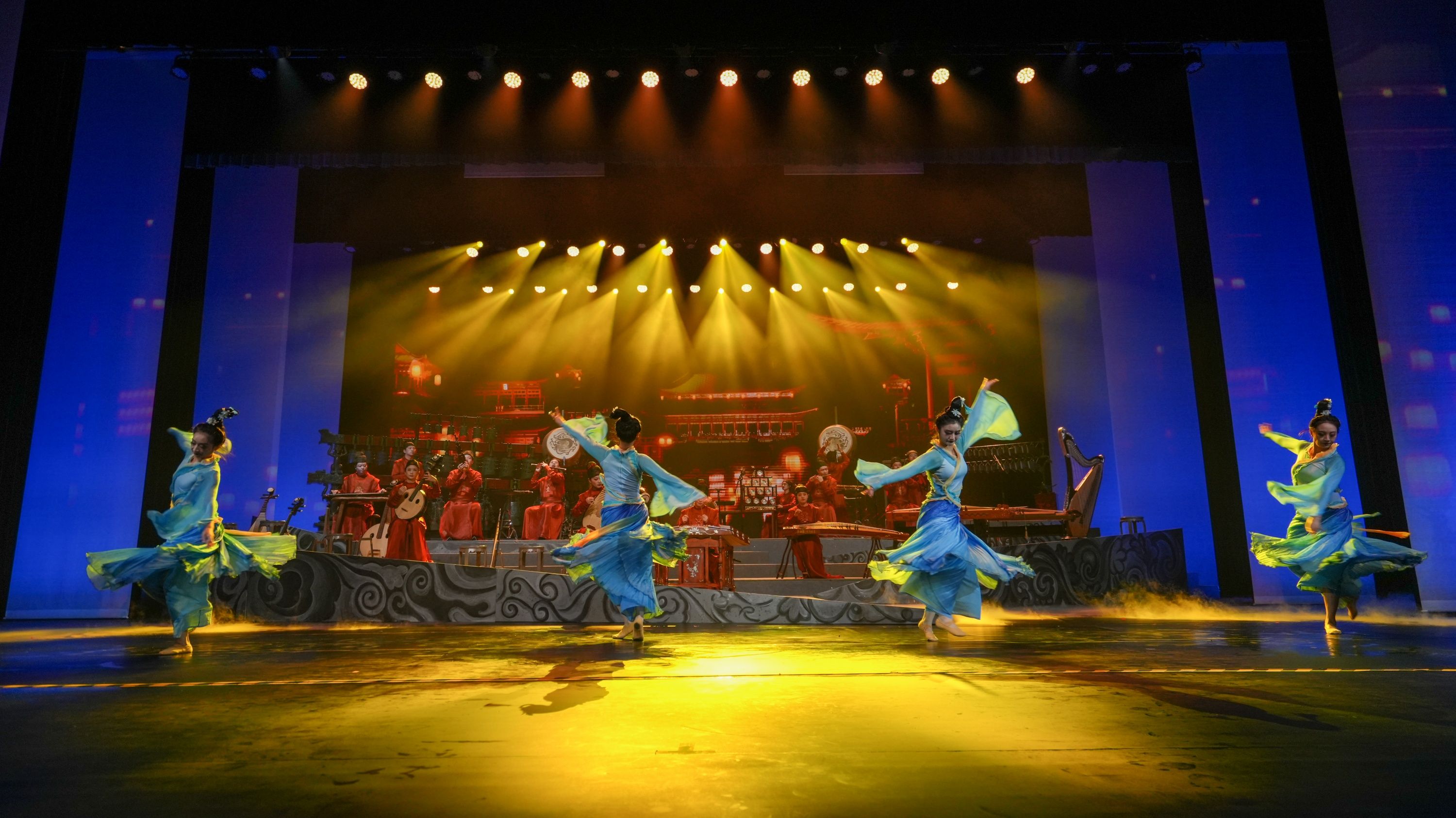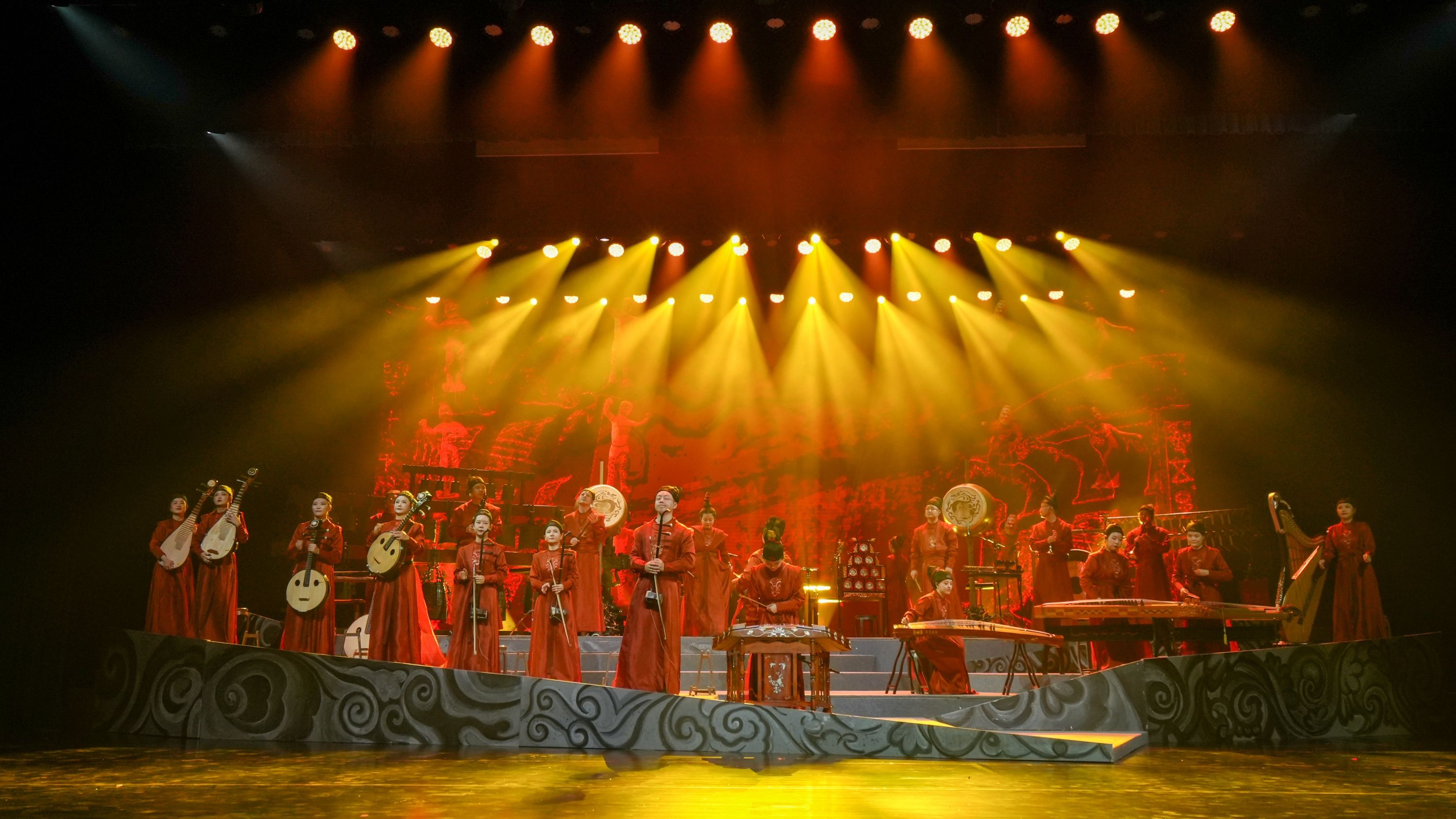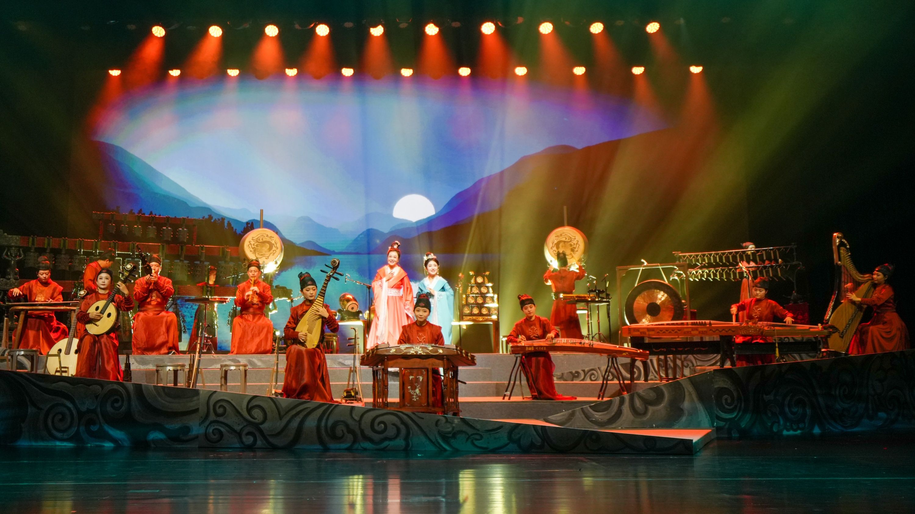 眼前美如画卷,乐团的乐师、歌者、舞者,身着古色古香的唐装,配以华丽的妆容,好像音乐仙子落入凡间。